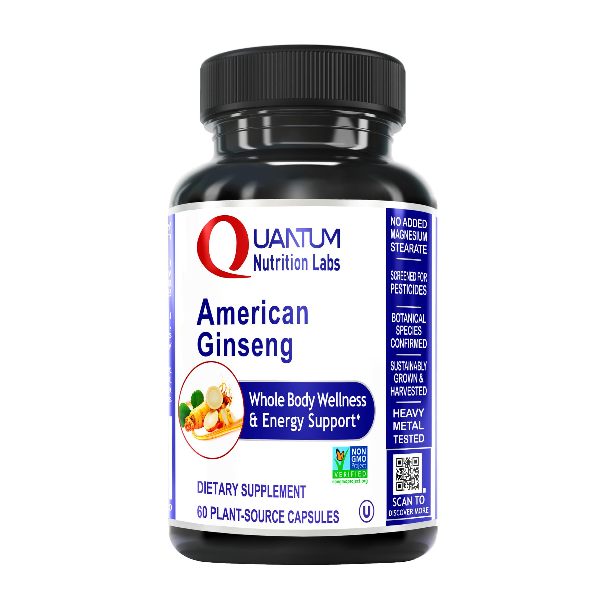 THE QUANTUM DIFFERENCE - At Quantum Nutrition Labs, we create well-researched, natural supplements made without unnecessary additives, designed to support overall health and well-being. NATURAL ADAPTOGEN - Ginseng has adaptogenic properties that may protect against harmful effects of stress. We recommend you take 2 pure American ginseng root capsules daily to promote overall wellness. ANCIENT HERB - American Ginseng (Panax quinquefolius) has a history of traditional use. For centuries, Indigenous Americans used it as an energizing tonic to promote calm to support lung health. PURE AMERICAN GINSENG EXTRACT - Formulated with pure ginseng root extract, this adaptogen capsule bolsters overall wellness and bolsters vitality with 900 mg of ginseng extract per serving. CALMING ENERGY - Our American Ginseng Capsules are crafted from pure all-American ginseng, an adaptogen known to promote calm energy and enhance resilience.