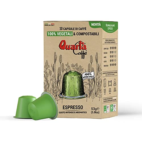 Safety Warning: May contain caffeine. store in a cool, dry place away from direct sunlight and extreme temperatures.Pack of 10 capsules. Compatible with Nespresso. 100 plant-based and compostable capsules.Avertissement De Sûreté Peut contenir de la caféine. Conserver dans un endroit frais et sec, à l'abri de la lumière directe du soleil et des températures extrêmes.Paquet de 10 capsules. Compatible avec Nespresso. Capsules 100 végétales et compostables.Quarta Caffè Capsules 100 végétales et compostables 10 pcs. Compatible avec Nespresso