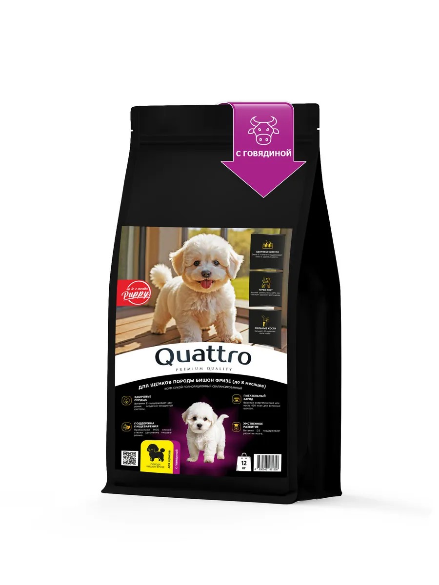 | Комплектация | Сухой корм для щенков квадро, сухой корм для щенков Quattro, в пакете мешке, 1 упаковка, для Бишон фризе |