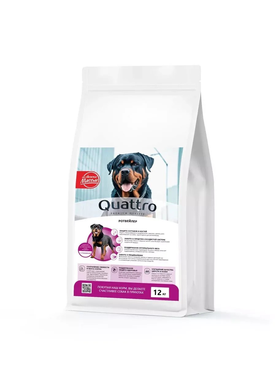 Корм Quattro - это полнорационный сухой корм премиум класса, специально разработанный с учетом потребностей ротвейлеров. Сухой корм для собак этой породы содержит оптимально подобранные ингредиенты, которые способствуют поддержанию здоровья и хорошего самочувствия питомцев. Свежая говядина в составе корма Quattro обеспечивает животных необходимым белком для поддержания мышечной массы, что особенно важно для сильных и выносливых ротвейлеров.