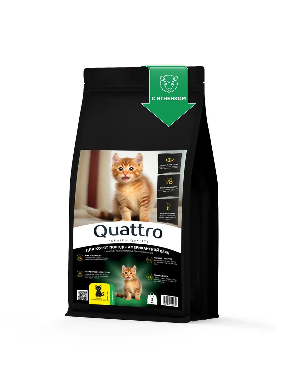 | Комплектация | Корм для котят Квадро, корм для котят Quattro, породы американский кёрл, корм сухой |