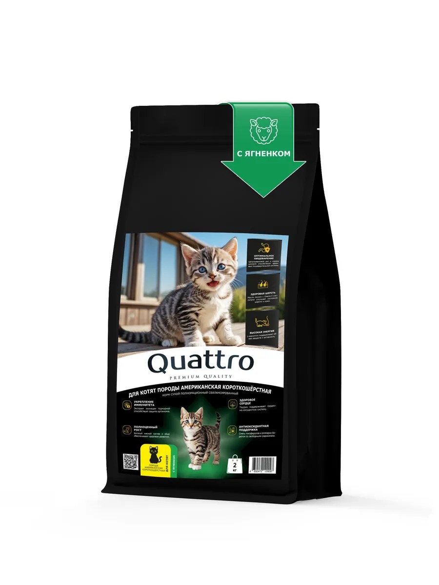 | Комплектация | Корм для котят Квадро, корм для котят Quattro, породы Американская короткошёрстная, корм сухой |