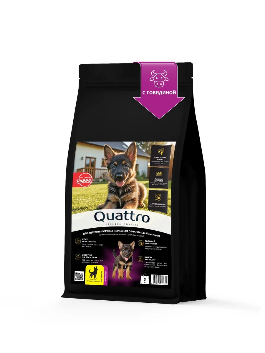 | Комплектация | Сухой корм для щенков квадро, сухой корм для щенков Quattro, в пакете мешке, 1 упаковка, для Немецкая овчарка |