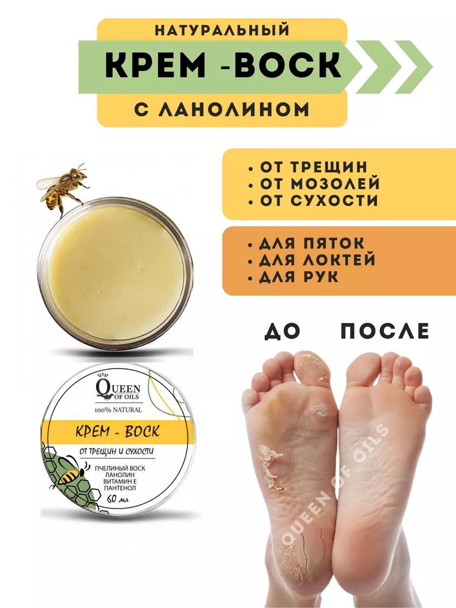 Крем воск от трещин и сухости с ланолином натуральной косметики Queen of Oils. Идеальный уход для сухой и потрескавшейся кожи пяток, локтей, ног и рук. Воск от трещин и сухости с уникальной формулой, включающей ланолин, пчелиный воск, кокосовое масло, масло ши, эфирное масло вербены, масло сладкого миндаля, витамин Е и пантенол. Крем для тела создан для мощного заживления трещин и увлажнения кожи, обеспечивая быстрое восстановление и уход.