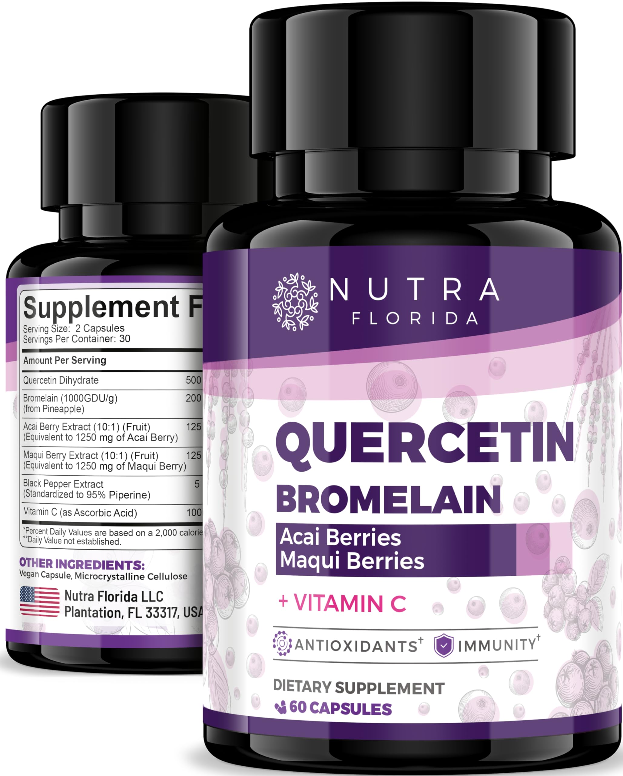 Quercetin 500mg with Bromelain Supplements | Powerful Antioxidant Complex with Acai Berry Maqui Berry & Vitamin C | Natural Bioflavonoid for Immune Defense | Vegan Gluten Free Non-GMO | 60 Capsules