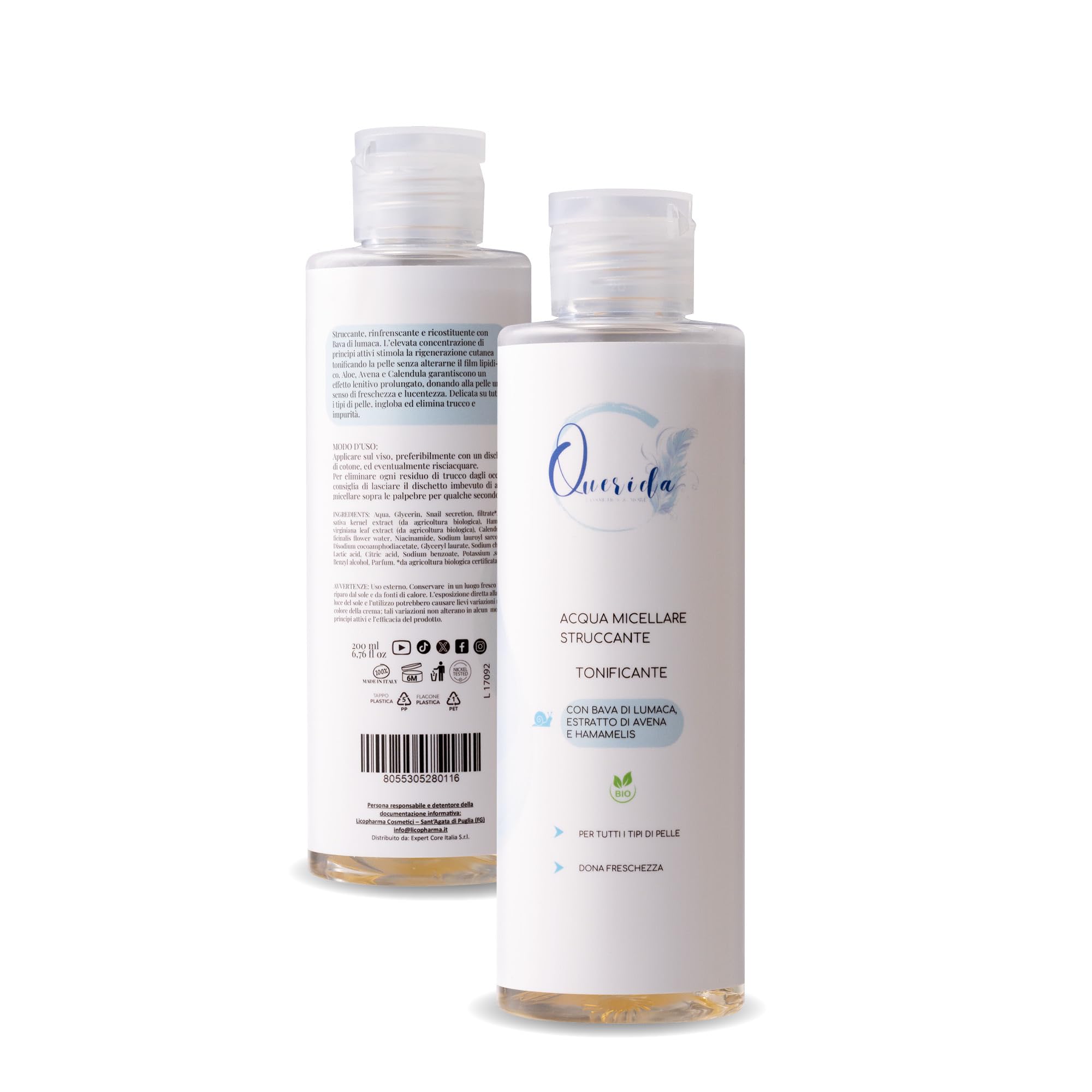 Discover Querida's Toning Micellar Cleansing Water, the essential product for deep and effective facial cleansing. This professional product combines the makeup-removing action of micelles with a powerful toning and regenerating effect on the skin. Developed in Querida's Italian laboratories, this micellar water represents the evolution of daily cleansing. The micelles in the formula effectively capture and remove makeup, impurities, and excess sebum, while respecting the skin's natural balance. The result is perfectly cleansed, fresh, and revitalized skin, ready for skincare treatments. SAFETY WARNING For external use only. Avoid contact with eyes.[Gentle formula for all skin types] - Developed to suit all skin types, even the most sensitive. Its refreshing and restorative action leaves skin perfectly cleansed without irritation or redness. [Regenerating treatment] - Its active ingredients promote skin regeneration, improving skin texture and stimulating cell renewal. Ideal for daily use as part of your beauty routine. [Immediate toning action] - Enriched with toning actives that revive the complexion and restore skin elasticity. After use, skin immediately appears fresher, brighter, and revitalized. [Advanced micellar formula] - High-efficiency micellar water that gently removes makeup, impurities, and excess sebum. Its innovative formula respects the skin's natural balance, ensuring deep yet gentle cleansing.Querida Eau micellaire démaquillante tonifiante – Nettoyant visage délicat pour tous les types de peau – Formule rafraîchissante avec agents régénérants – Fabriqué en Italie – 200 mlDESCRIPTION DU PRODUIT DESCRIPTION DU PRODUIT Découvrez l'eau micellaire démaquillante tonifiante de Querida, le produit essentiel pour un nettoyage profond et efficace du visage. Ce soin professionnel allie l'action démaquillante des micelles à un puissant effet tonifiant et régénérant pour la peau. Développée dans les laboratoires italiens de Querida, cette eau micellaire représente l'évolution du nettoyage quotidien. Les micelles contenues dans la formule capturent et éliminent efficacement le maquillage, les impuretés et le sébum en excès, tout en respectant l'équilibre naturel de la peau. Le résultat est une peau parfaitement nettoyée, fraîche et revitalisée, prête pour les traitements de skincare. AVERTISSEMENT DE SÉCURITÉ Usage extérieur uniquement. Évitez tout contact avec les yeux.[Formule délicate pour tous les types de peau] - Développée pour s'adapter à tout type de peau, même les plus sensibles. Son action rafraîchissante et reconstituante laisse la peau parfaitement nettoyée sans irritation ni rougeur. [Traitement régénérant] – Ses composants actifs favorisent la régénération cutanée, améliorant la texture de la peau et stimulant le renouvellement cellulaire. Idéal pour un usage quotidien dans le cadre de la routine de beauté. [Action tonifiante immédiate] – Enrichie en actifs tonifiants qui ravivent le teint et redonnent de l'élasticité à la peau. Après utilisation, la peau apparaît immédiatement plus fraîche, lumineuse et revitalisée. [Formule micellaire avancée] – Eau micellaire à haute efficacité qui élimine délicatement le maquillage, les impuretés et l'excès de sébum. Sa formule innovante respecte l'équilibre naturel de la peau, assurant un nettoyage profond mais non agressif.