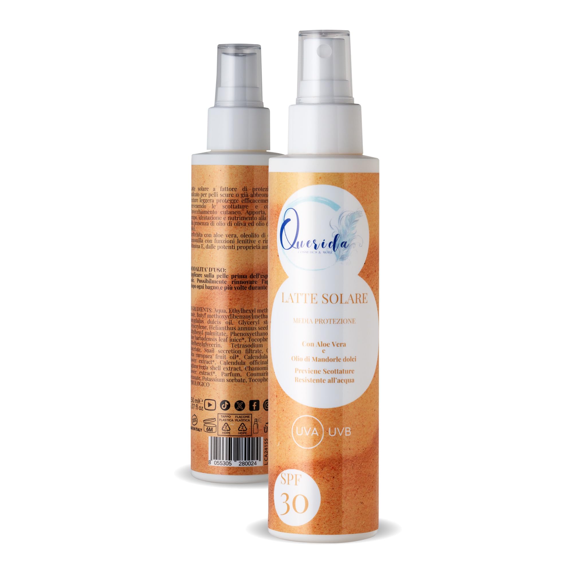 Discover professional sun protection with Querida SPF30 Sunscreen Lotion, the Italian skincare brand founded by Cristiana, a beautician with over 20 years of experience in the beauty industry. Our exclusive formula combines medium SPF30 sun protection with precious natural ingredients to care for your skin during sun exposure. Aloe vera and calendula work together to provide deep hydration and a soothing effect, while sweet almond and olive oils deeply nourish the skin. The spray texture has been specially designed to guarantee easy and even application, ideal for covering even the most difficult-to-reach areas. The water-resistant formula effectively protects you while swimming in the sea or pool, while maintaining its protective efficacy. Why choose Querida SPF30 Sunscreen Lotion: EU-certified UVA UVB protection Water-resistant formula Lightweight and fast-absorbing texture High-quality natural ingredients Suitable for all skin types. Not tested on animals. Directions: Apply generously to the entire body before sun exposure. Reapply frequently, especially after bathing, drying off, or excessive sweating. SAFETY WARNING For external use only. Avoid contact with eyes.