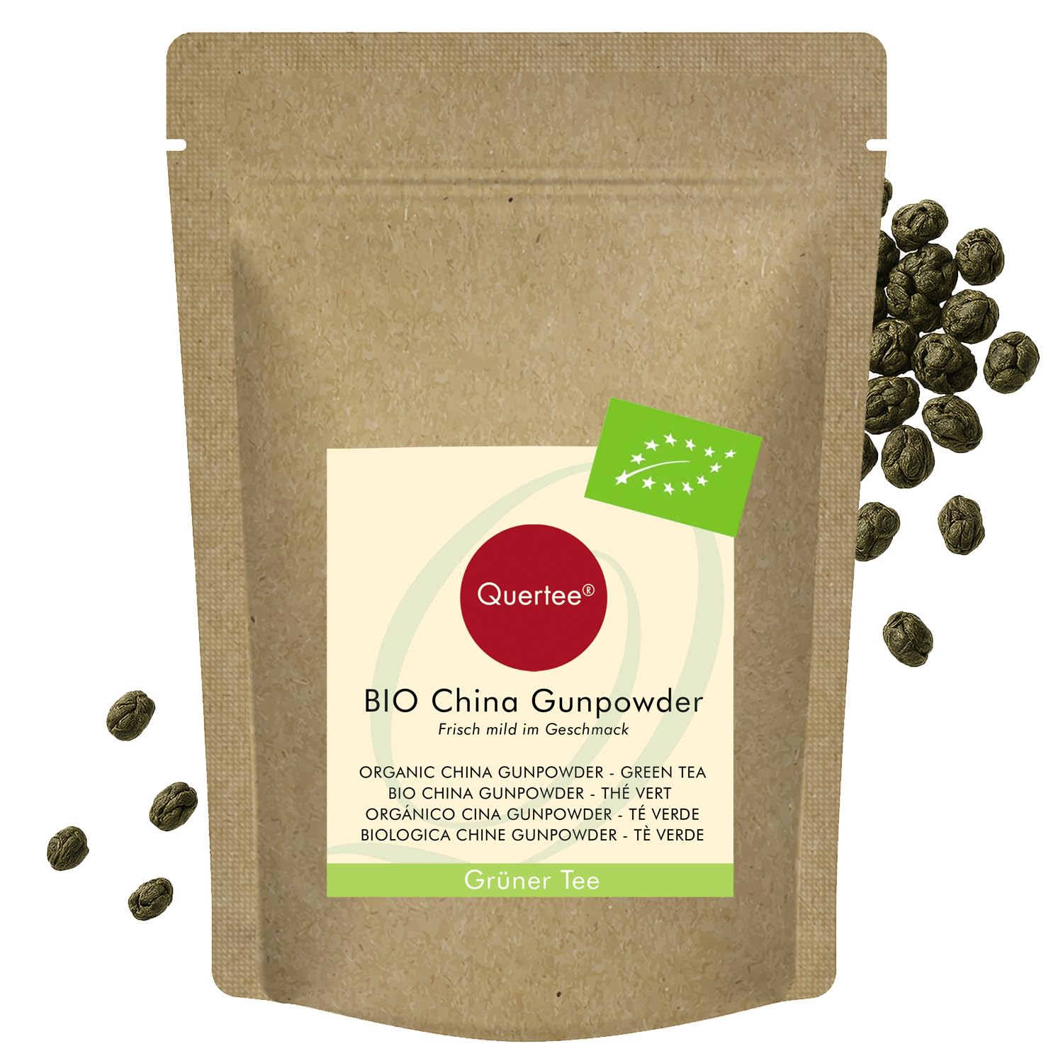 Quertee - Organic - Green Tea - Gunpowder Green Tea Smooth and delicate taste. Ingredients: Green tea From certified organic farming. Our certification body: DE-ÖKO-007 Preparation: Use 1 teaspoon of tea per cup (approximately 200 ml). Pour hot water at 80 C and let it steep for 2 to 3 minutes. Store in a cool, dry, and dark place. Our Gunpowder tea is a special type of green tea named for its characteristic spherical shape. The tea is made from tea leaves that are rolled and steamed quickly after harvesting to prevent oxidation. This results in the tea leaves remaining firm and compact, giving them their characteristic spherical shape. Overall, Gunpowder green tea is an excellent choice for tea lovers who prefer a mild, refreshing, and slightly acidic brew. INGREDIENTS Green tea From certified organic farming INSTRUCTIONS Use 1 teaspoon of tea per cup (approximately 200 ml). Pour hot water (80 C) over the tea and let it steep for 2 to 3 minutes. SAFETY WARNING Contains caffeine. Not recommended for children or pregnant women. See more