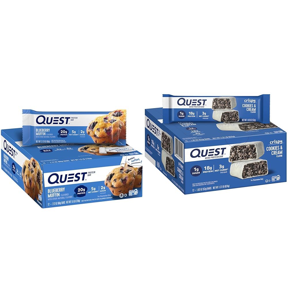 SWEET WITHOUT ADDED SUGAR: Enjoy the sweet taste without worrying about excess added sugar with the Blueberry Muffin Bar having no added sugar and the Cookies Cream Bar having 1g sugar per bar. FIBER IS YOUR FRIEND: The Blueberry Muffin Bar has 13g fiber and the Cookies Cream Bar has 6g fiber to provide a more complete macro profile. UNWRAP COMPLETE PROTEINS: Both bars are made with complete, dairy-based proteins to provide your body with 9 essential amino acids. YOU DESERVE A SWEET TREAT: The Quest Cookies Cream Hero Protein Bar tastes like an indulgent candy bar with 18g protein, 3g net carbs and 1g sugar. A BREAKFAST MUFFIN FOR ANY TIME OF DAY: The Quest Blueberry Muffin Protein Bar tastes like a muffin straight from the coffee shop with 21g protein and 2g sugar.
