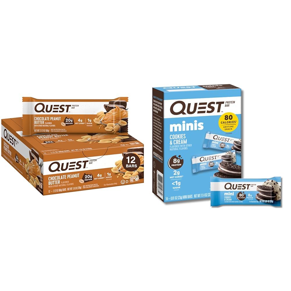 SWEET WITHOUT ADDED SUGAR: Enjoy the bars without worrying about added sugars with 1g or less of sugar per bar. FIBER IS YOUR FRIEND: The Quest Bars have 11g of fiber to provide your body with a more complete macro profile. ENJOY 14 MINI COOKIES CREAM BARS: The bundle includes Quest Mini Cookies Cream Protein Bars that fit right into your busy schedule. UNWRAP COMPLETE PROTEINS: The Quest Bars are made with complete, dairy-based proteins to provide 9 essential amino acids. YOU DESERVE A SPECIAL TREAT: The Quest Chocolate Peanut Butter Bars have 20g protein, 5g net carbs and 1g of sugar per bar.