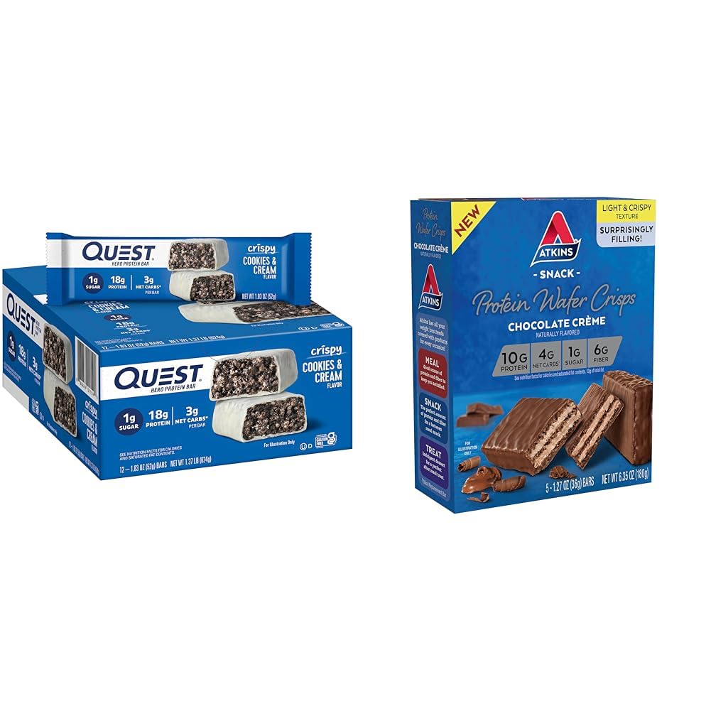 Quest Cookies & Cream Hero Protein Bar 18g Protein 12 Count and Atkins Chocolate Cr me Protein Wafer Crisps 5g Net Carb 5 Count