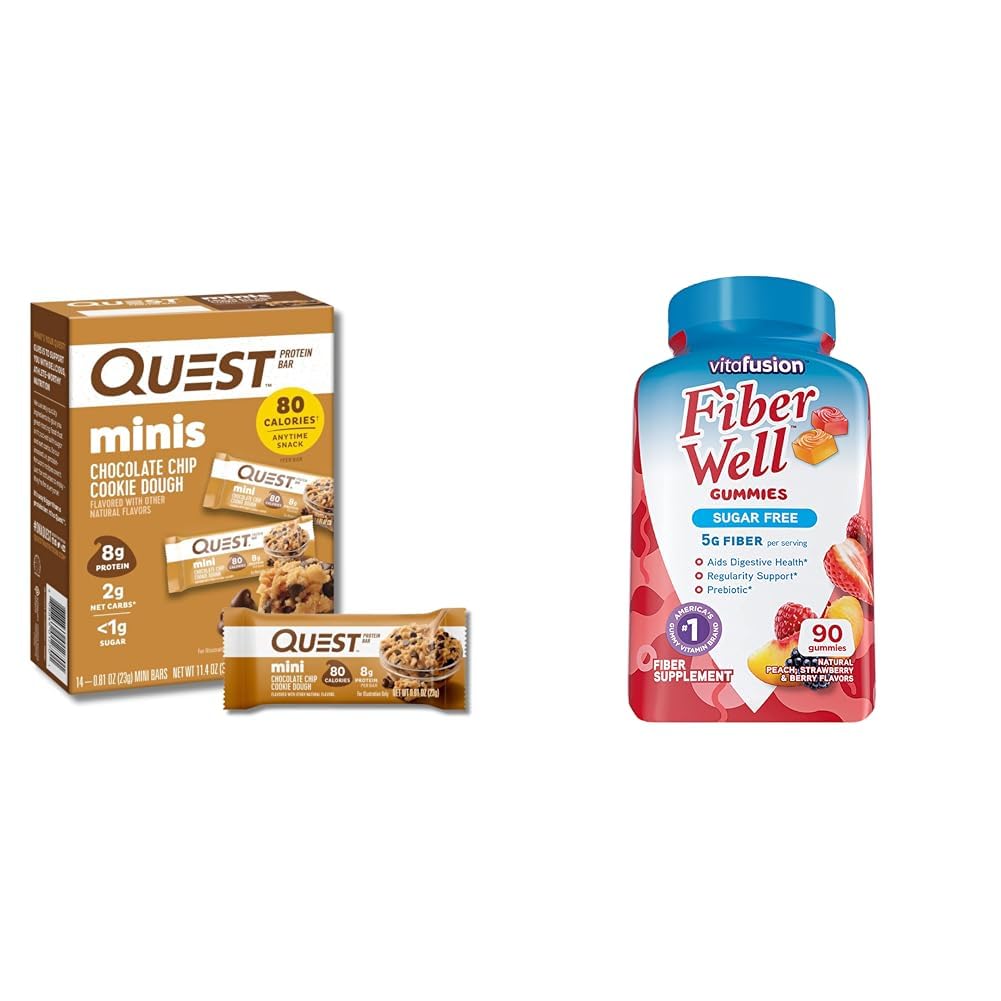 Satisfy your sweet tooth and support your health goals with this protein bar and fiber supplement bundle. The Quest Nutrition Mini Chocolate Chip Cookie Dough Protein Bars provide 14 satisfying snacks with 8g of protein and 4-5g of fiber per mini bar. Enjoy the delicious cookie dough flavor packed into a protein-rich, low carb, keto-friendly bar. Pair it with the Vitafusion Fiber Well daily fiber supplements, with 90 sugar-free gummies that provide 5g of prebiotic fiber per serving to support digestive health. The Fiber Well gummies come in natural peach, strawberry and blackberry flavors for a delicious way to get your daily fiber. Together, these two products complement each other perfectly - the protein bars deliver protein to help build and maintain muscle, while the fiber gummies promote healthy digestion. The Quest bars feature high quality dairy proteins to provide amino acids for performance and recovery. The Fiber Well gummies contain prebiotic fiber to support a healthy gut microbiome. Both products are portable, tasty snacks that you can enjoy at home or on-the-go. Level up your nutrition routine with this bundle that fuses great taste and quality ingredients to help you feel your best.