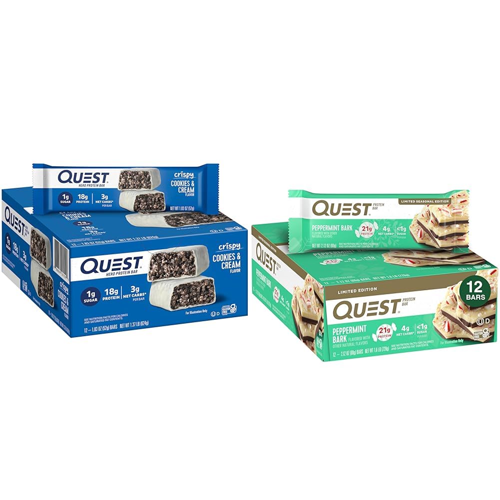 Quest Nutrition Crispy Cookies Cream Hero Protein Bar, 18g Protein, 1g Sugar, 3g Net Carb, Gluten Free, Keto Friendly, 12 Count Due to global supply chain issues, Quest™ recently reformulated some of its products to contain soy lecithin and or vegetable oil including soybean which is considered an allergen. The small amount contained within the product will not change the quality, flavor or texture of the product. We remain committed to using the high quality dairy-based proteins to help give you the amino acids you need. Quest Nutrition Peppermint Bark Protein Bar, 21g Protein, 4g Net Carb, 1g Sugar, Gluten Free, 12 Count Quest™ Peppermint Bark Protein Bars are coated in white chocolatey goodness and sprinkled with pepperminty chunks to create the perfect holiday flavor. These delicious bars have 21g of protein, 4g net carbs and 1g of sugar per serving . You would be hard pressed to find a protein bar quite like the Quest Peppermint Bark Protein Bar. The pepperminty chunks and white chocolate flavor won't be around for long, so get this great flavor while you can.