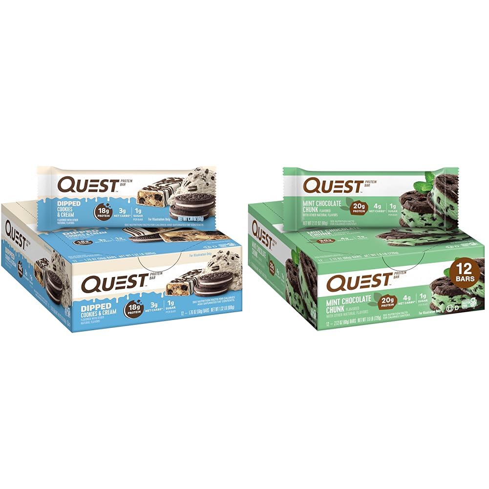 Quest Nutrition Dipped Chocolate Cookies Cream Protein Bars, High Protein, Low Carb, Gluten Free, Keto Friendly, 12 Count Quest™ Dipped Cookies Cream Protein Bars. Your favorite Quest protein bars! Try them Dipped! Enjoy the delicious taste of classic cookies cream protein bar dipped and drizzled with a sweet chocolatey coating. Try the protein bars with 18g of protein and 3g of net carbs , and dipped in chocolatey goodness. Quest Nutrition Mint Chocolate Chunk Protein Bars, High Protein, Low Carb, Gluten Free, Keto Friendly, 12 Count Mint Chocolate Chunk: The classic refreshingly sweet flavor of mint and chocolate combine in perfect harmony in the Mint Chocolate Chunk Quest Bar. Take a minute out of your day to crave pure enjoymint.