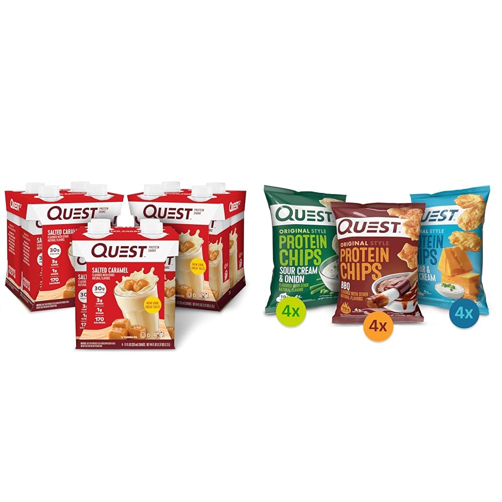 Quest Nutrition Ready to Drink Salted Caramel Protein Shake, High Protein, Low Carb, Gluten Free, Keto Friendly, 4 Count(Pack of 3) Due to global supply chain issues, Quest™ recently reformulated some of its products to contain soy lecithin and or vegetable oil including soybean which is considered an allergen. The small amount contained within the product will not change the quality, flavor or texture of the product. We remain committed to using the high quality dairy-based proteins to help give you the amino acids you need. Quest Nutrition Protein Chips Variety Pack, (BBQ, Cheddar Sour Cream, Sour Cream Onion), High Protein, Low Carb, 1.1 Ounce (Pack of 12) Due to global supply chain issues, Quest™ recently reformulated some of its products to contain soy lecithin and or vegetable oil including soybean which is considered an allergen. The small amount contained within the product will not change the quality, flavor or texture of the product. We remain committed to using the high quality dairy-based proteins to help give you the amino acids you need.Product 2: CHIPS THAT TRAVEL WITH YOU. Take them with you in your backpack, purse, car console, gym bag or wherever your adventures take you. Product 2: SALTY, SAVORY, CRUNCHY. A crunchy chip that's been seasoned to perfection. Product 2: ENJOY MORE. CARB LESS. Quest Baked Protein Chips provide all the crunch and satisfying taste of a regular potato chip, but ours have 19 grams of protein and 4 grams of net carbs per serving. Product 2: QUEST PROTEIN CHIPS VARIETY PACK. All your favorite tastes in one great place. Enjoy the classic flavors of BBQ, SOUR CREAM ONION, and CHEDDAR SOUR CREAM all in one pack. Product 1: SHAKES THAT TRAVEL WITH YOU: Take Quest Salted Caramel Protein Shakes with you in your backpack, purse, car console, cup holder, gym bag or wherever your adventures take you. Product 1: SWEET WITHOUT ALL THE SUGAR: Enjoy the refreshing taste of a salted caramel shake with 1g of sugar. Product 1: NATURALLY FLAVORED: Quest Salted Caramel Protein Shakes are sweet tasting refreshments that are non-GMO and naturally flavored. Product 1: SIMPLY MADE WITH 11 INGREDIENTS: The Quest Salted Caramel Protein Shake is a creamy caramel shake you can enjoy any time with 30g of protein, 3g carbs and 1g of sugar per shake.
