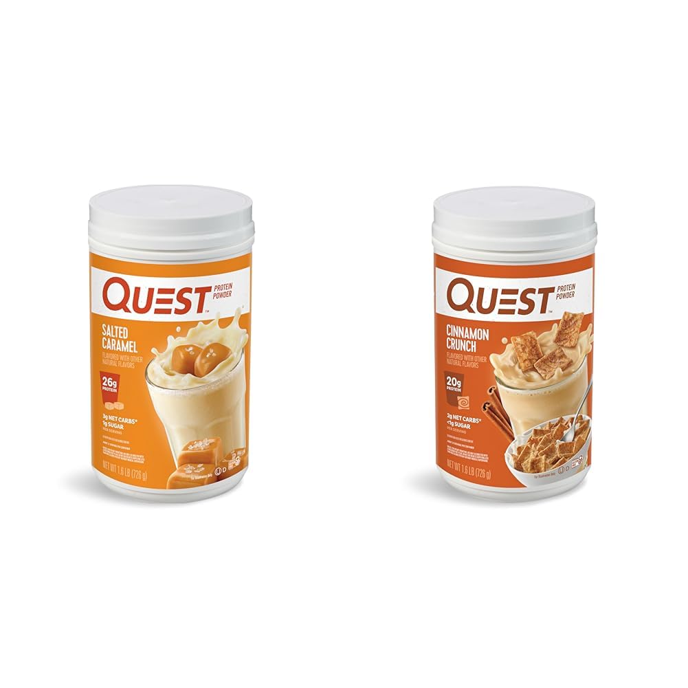 Product 2: NOT PACKED WITH SUGAR: Enjoy the sweet taste of a cinnamon crunch with less than 1g of sugar per scoop . Product 2: FAST AND SLOW ABSORBING PROTEIN: Quest Cinnamon Crunch Protein Powder is made with 60 fast absorbing Whey Protein Isolate and 40 slow absorbing Micellar Casein to provide balance for your workout. Product 2: SIP ON PROTEINS: Quest Cinnamon Crunch Protein Powder is made with dairy-based proteins. Product 2: SHAKE UP YOUR ROUTINE: Quest Cinnamon Crunch Protein Powder provides you with a delicious protein boost with 20g protein, 2g net carbs and less than 1g of sugar per scoop . Product 1: NOT PACKED WITH SUGAR: Enjoy the creamy and rewarding taste of a salted caramel shake with 1g of sugar per scoop . Product 1: FAST AND SLOW ABSORBING PROTEIN: Quest Salted Caramel Protein Powder is made with 60 percent fast absorbing Whey Protein Isolate and 40 percent slow absorbing Micellar Casein to provide balance for your workout. Product 1: SIP ON PROTEINS: Quest Salted Caramel Protein Powder is made with dairy-based proteins. Product 1: SHAKE UP YOUR ROUTINE: Quest Salted Caramel Protein Powder provides you with a delicious protein boost with 26g protein, 3g net carbs and 1g of sugar per scoop .