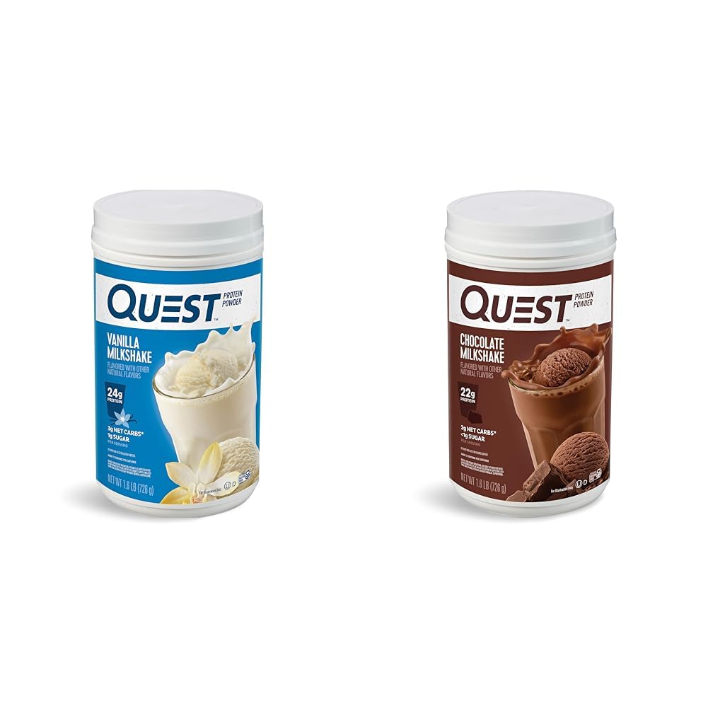 Quest Nutrition Vanilla Milkshake Protein Powder 24g of Protein 1g of Sugar 1.6 Pound 23 Servings & Chocolate Milkshake Protein Powder 22g Protein 2g Net Carbs 1g Sugar Low Carb