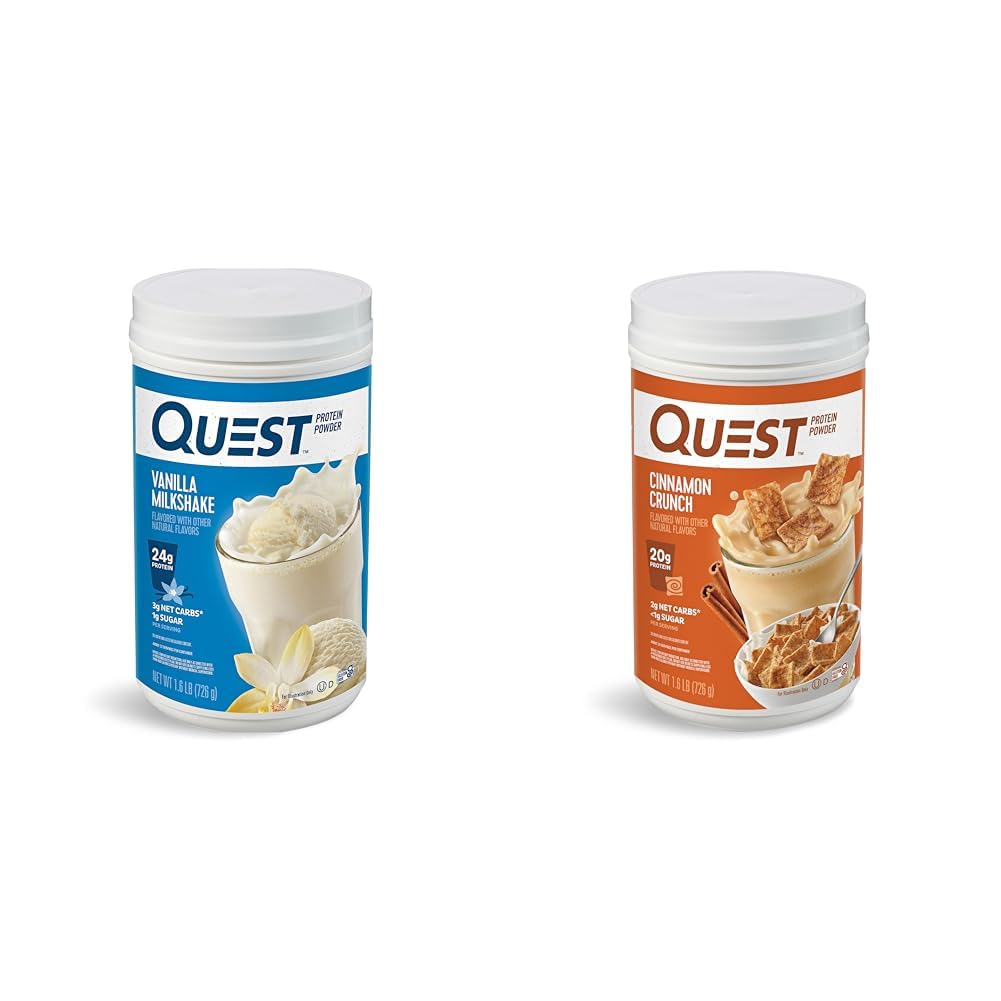 Quest Nutrition Vanilla Milkshake Protein Powder 24g of Protein 1g of Sugar 1.6 Pound 23 Servings & Cinnamon Crunch Protein Powder 20g Protein 2g Net Carb 1g Sugar Low Carb