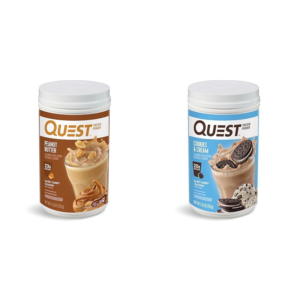 Includes 1.6 lbs each of Peanut Butter and Cookies Cream flavored Quest protein powders, 47 total servings. Fast and slow absorbing whey and casein proteins provide an ideal balance for your workout. Quest protein powders contain complete, dairy-based proteins for athlete-worthy nutrition. Enjoy 20g protein, 2g net carbs, and less than 1g sugar per scoop with rich Quest Cookies Cream protein powder. Get 23g protein, 2g net carbs, and 1g sugar per scoop with delicious Quest Peanut Butter protein powder.