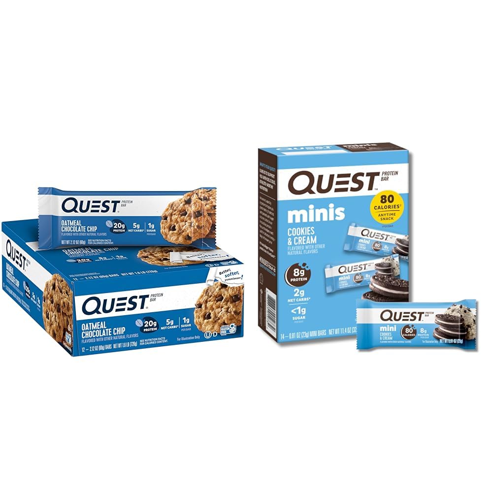 Quest Protein Bars Bundle: Oatmeal Chocolate Chip (12 Count) and Cookies & Cream Mini (14 Count)
