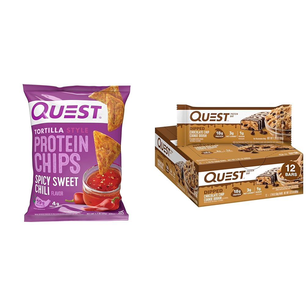 FIBER IS YOUR FRIEND: Each Quest Dipped Chocolate Chip Cookie Dough Protein Bar has 9g of fiber per serving to provide your body with a more complete macro profile. SWEET WITHOUT ADDED SUGAR: Enjoy the rewarding taste of Chocolate Chip Cookie Dough without worrying about added sugars. The Quest Dipped Chocolate Chip Cookie Dough Protein Bar has no added sugars. SPICY, SWEET CRUNCH: Quest Spicy Sweet Chili Tortilla Style Protein Chips are seasoned to perfection and contain no added soy ingredients. UNWRAP COMPLETE PROTEINS: Quest Dipped Chocolate Chip Cookie Dough Protein Bars are made with complete, dairy-based proteins to provide your body with 9 essential amino acids. ENJOY MORE. CARB LESS: The Quest Spicy Sweet Chili Tortilla Style Protein Chips provide all the crunch and satisfying taste of a regular tortilla chip Only ours have 19g of protein and 4g net carbs per bag.