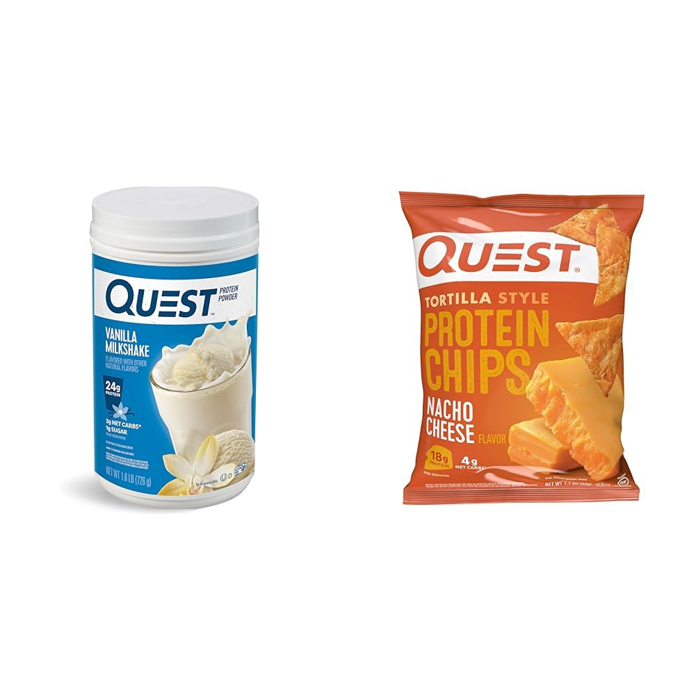 The Quest Nutrition protein bundle includes a 1.6-pound container of creamy vanilla milkshake flavored protein powder and a pack of 12 bags of nacho cheese tortilla-style protein chips. The protein powder provides 24g of protein, 3g net carbs, and 1g sugar per scoop to power your workouts. With whey and casein proteins, it delivers both fast and slow protein absorption. The baked protein chips supply 18g protein and 4g net carbs per bag with the same salty, savory nacho cheese flavor and crunch of regular tortilla chips. Together, these complementary Quest Nutrition products give you delicious, high protein options for before, during or after workouts or on-the-go. Whip up a protein shake with the powder and crunch on the grab-and-go chips when you need a salty, protein-packed snack.