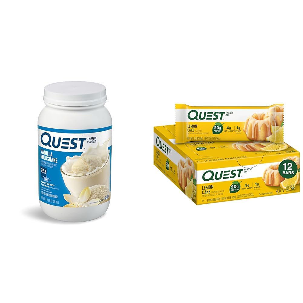 Enjoy delicious and nutritious protein snacks with this bundle containing Quest's Vanilla Milkshake Protein Powder and Lemon Cake Protein Bars. The protein powder provides 24g of protein per scoop to help build and maintain muscle, along with only 3g net carbs and 1g sugar. It contains both fast-absorbing whey protein isolate and slow-absorbing micellar casein. Enjoy it before or after workouts to aid muscle recovery and growth. Complementing the powder, the lemon cake protein bars supply 20g protein and just 4g net carbs and 1g sugar per bar. They offer the sweet lemon cake taste you crave with 13g fiber and no added sugars. The bars provide complete proteins and essential amino acids to help satisfy hunger and sweet cravings on-the-go. With delicious flavors and high protein content to support energy, muscle building, and satisfying snacks, Quest's Vanilla Milkshake Protein Powder and Lemon Cake Protein Bars bundle makes an ideal choice for active, health-conscious lifestyles.