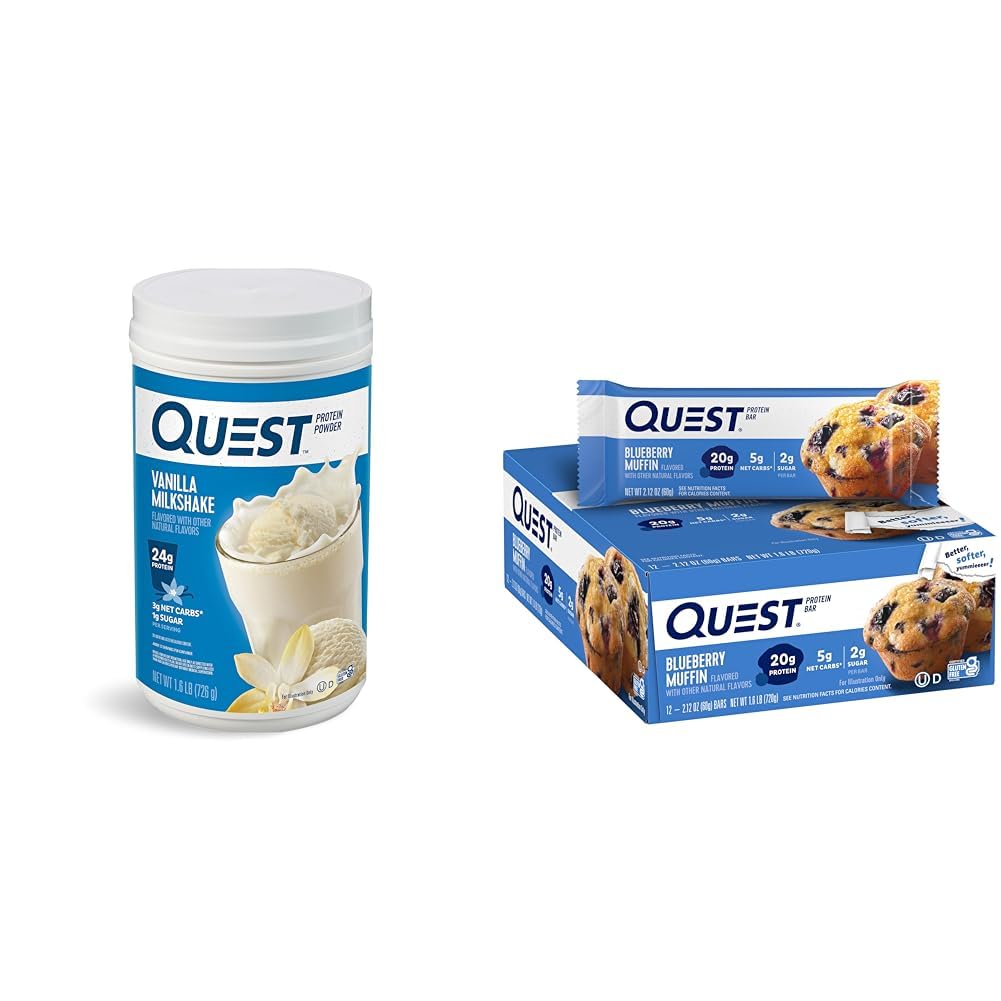 Quest Vanilla Milkshake Protein Powder with 24g Protein Blueberry Muffin Protein Bars with 21g Protein 1.6lb Powder 12 Count Bars