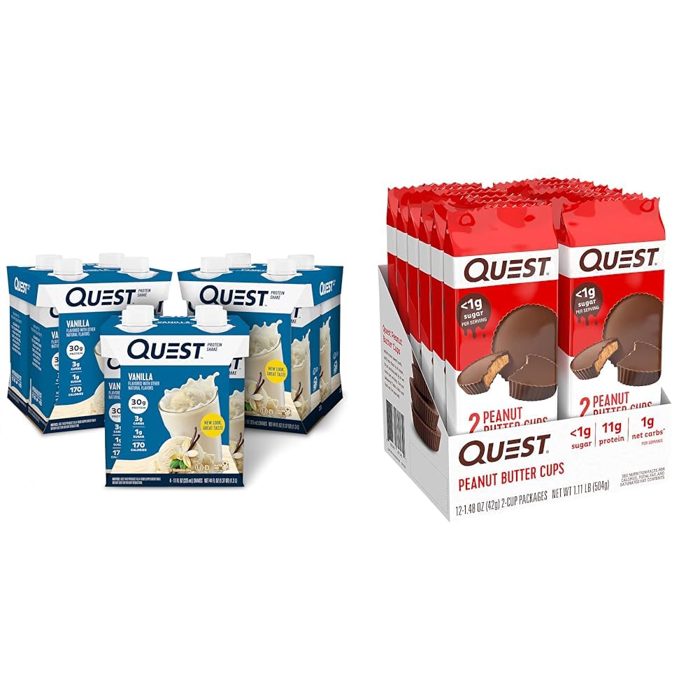 Convenient shakes and indulgent treats to satisfy cravings at home or on-the-go. Enjoy the sweet taste of vanilla shakes and peanut butter cups with very little sugar. Both products are made with complete, dairy-based proteins to provide essential amino acids. Includes a 17.76 oz pack of Quest Peanut Butter Cups with less than 1g of sugar and 4g of fiber per serving. Contains 12 packs of Quest Vanilla Protein Shakes with 30g of protein and only 1g of sugar per shake.