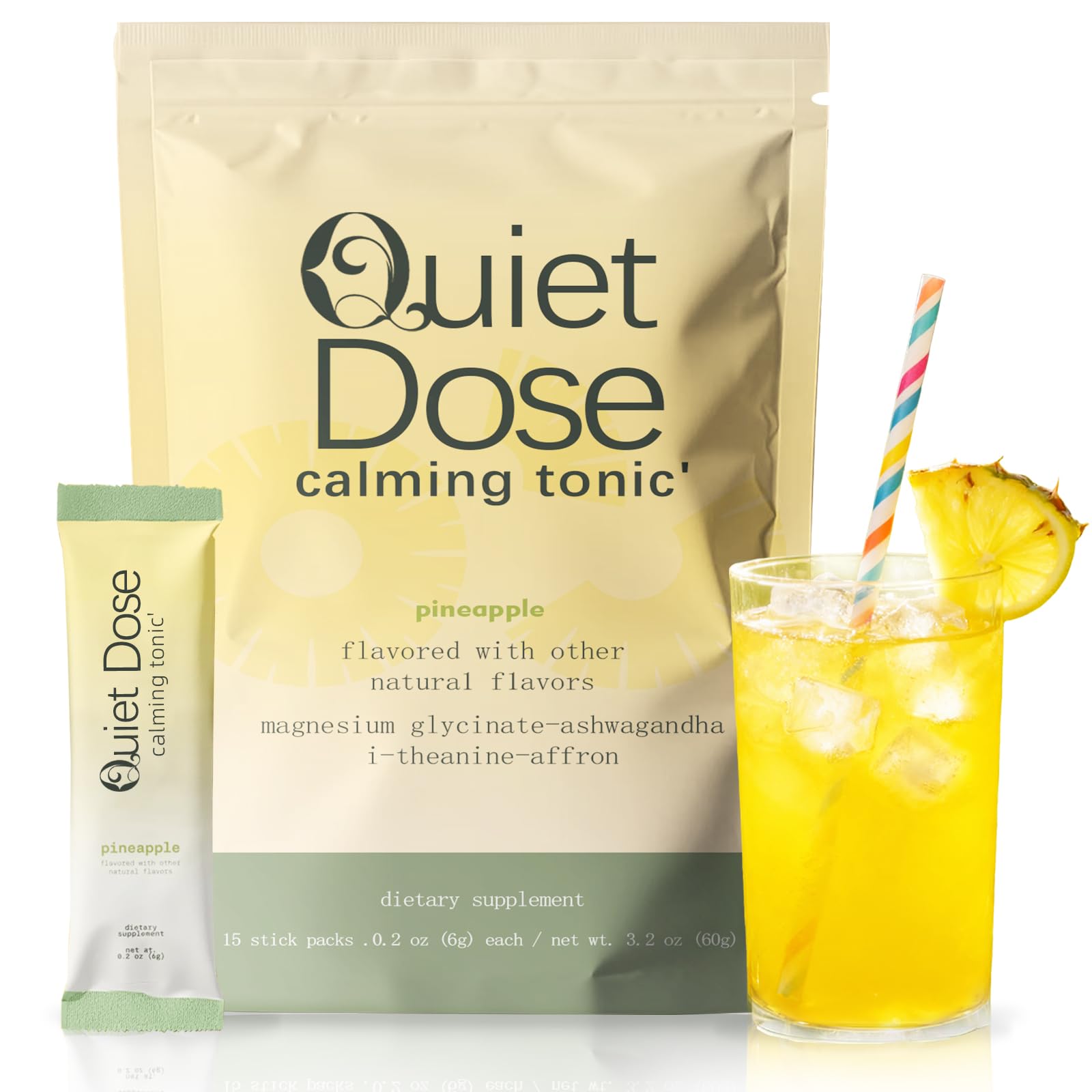 Quiet Dose Drink Calming Relaxation Beverage with L-Theanine Saffron & Ashwagandha Stress Relief & SleepSupport Non-GMO Vegan -15 Pack (Pineapple Flavor)