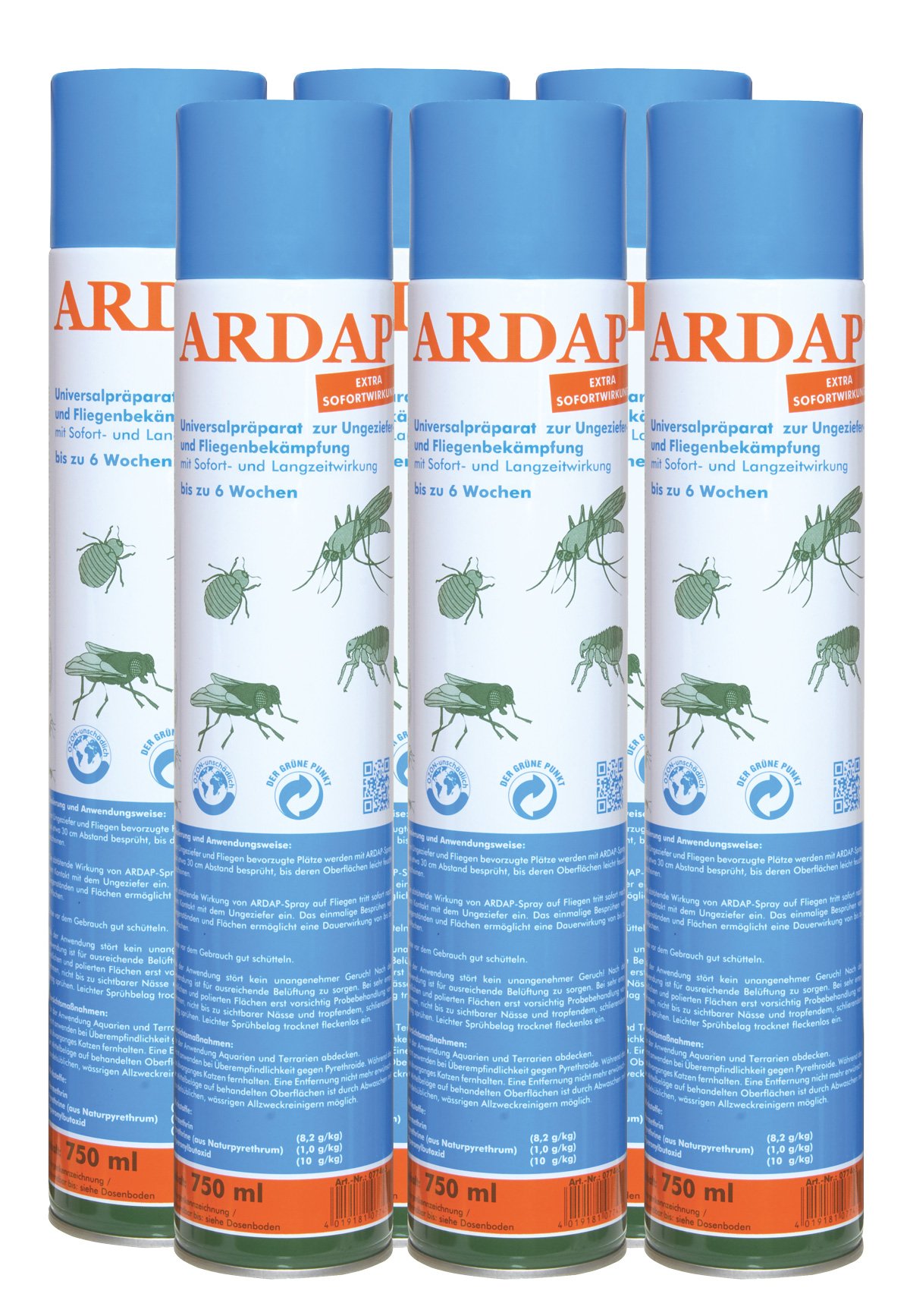 Universal preparation for vermin and fly control with immediate and long-term effects for up to 6 weeks.Cutty and contact insecticidal for use against all types of flies, twin-flüglers and other pests or pests, such as beetles, mites, ticks, fleas, cockroaches, moths, mosquitoes, silver fish, spiders, asses, ants, wasps.Application in domestic and commercial areas and in animal husbandry (pigeon strikes, bird cages, animal dwellings, etc.).With the ARDAP Universal-UffenSPRAY, veterinarian and consumers have a means at hand in every situation that can be used and effective.Easy and permanently up to 6 weeks with acute vermal infestation for household, garden, animal husbandry, commercial and agriculture for larger areas and stables is the use of ARDAP vermin concentrate with a recommended dilution.Instructions for use: Shake can well before use.Spray the preferred places with ARDAP spray from a distance of approx. 30 cm until their surfaces appear slightly moist.Do not spray up to visible moisture and dripping, streaking surface.In the case of very sensitive and polished surfaces, carefully use the test treatment.Cover aquariums and terrariums before use.There is no unpleasant smell during the application.The killing effect of ARDAP spray occurs immediately after contact with the vermin.Spraying objects and areas once enables a permanent effect of up to 6 weeks.Keep pets away during the spray process.Sufficient ventilation after use.Light spray surface dries in stain.Comfortable middle coverings on treated surfaces can be removed with commercially available, aqueous all -purpose cleaners.Storage: keep heat, hot surfaces, sparks, open flames and other ignition sources away.Do not smoke.Do not spray against open flame or other ignition source.Usevermin-nebulizer.Always read the label and product information before use Baua No.: N-76620.Universalpräparat zur Ungeziefer- und Fliegenbekämpfung mit Sofort- und Langzeitwirkung bis zu 6 Wochen. Fraß- und Kontaktinsektizid zur Anwendung gegen alle Arten von Fliegen, Zweiflüglern und weiteren Schädlingen oder Lästlingen, wie Käfer, Milben, Zecken, Flöhe, Schaben, Motten, Mücken, Silberfischchen, Spinnen, Asseln, Ameisen, Wespen. Anwendung in häuslichen und gewerblichen Bereichen und in der Tierhaltung (Taubenschläge, Vogelkäfige, Tierbehausungen etc.). Mit dem ARDAP Universal-Ungezieferspray haben Tierarzt und Verbraucher in jeder Situation ein Mittel zur Hand, das unmittelbar einsetzbar und wirksam ist. Wirkt Sofort und Dauerhaft bis zu 6 Wochen Bei akutem Ungezieferbefall Für Haushalt, Garten, Tierhaltung, Gewerbe und Landwirtschaft Für größere Flächen und Ställe ist die Anwendung von ARDAP Ungeziefer-Konzentrat in empfohlener Verdünnung ideal. Gebrauchsanweisung: Dose vor Gebrauch gut schütteln. Von Ungeziefer und Fliegen bevorzugte Plätze mit ARDAP-Spray aus ca. 30 cm Abstand besprühen, bis deren Oberflächen leicht feucht erscheinen. Nicht bis zu sichtbarer Nässe und tropfendem, schlierendem Belag sprühen. Bei sehr empfindlichen und polierten Flächen erst vorsichtig Probebehandlung vornehmen. Vor der Anwendung Aquarien und Terrarien abdecken. Bei der Anwendung stört kein unangenehmer Geruch. Die abtötende Wirkung von ARDAP-Spray tritt sofort nach dem Kontakt mit dem Ungeziefer ein. Das einmalige Besprühen von Gegenständen und Flächen ermöglicht eine Dauerwirkung von bis zu 6 Wochen. Während des Sprühvorganges Haustiere fernhalten. Nach der Anwendung für ausreichende Belüftung sorgen. Leichter Sprühbelag trocknet fleckenlos ein. Nicht mehr erwünschte Mittelbeläge auf behandelten Oberflächen können mit handelsüblichen, wässrigen Allzweckreinigern entfernt werden. Aufbewahrung: Von Hitze, heißen Oberflächen, Funken, offenen Flammen und anderen Zündquellen fernhalten. Nicht rauchen. Nicht gegen offene Flamme oder andere Zündquelle sprühen.Ungeziefer-Vernebler vorsichtig verwenden. Vor Gebrauch stets Etikett und Produktinformationen lesen BAuA Nr.: N-76620.Quiko Ardap Spray 6 x 750ml