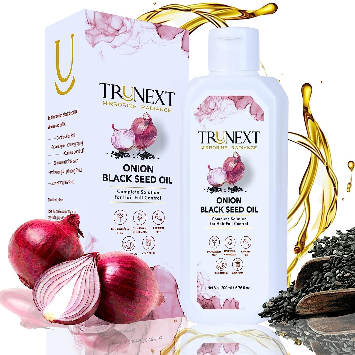 Our products are made from ancient and traditional Indian herbs and are composed of 100 natural active ingredients. Using organic and chemical-free, paraben-free, and cruelty-free products is the new way to take the utmost care of your body and soul. Ultimate and unique packaging with proven, results-driven ingredients. We are a team of passionate and enthusiastic individuals striving to provide the safest products for your skin, hair, and body.Apply this onion oil gently to your scalp and massage with your fingertips. Leave it on for 30 minutes, then rinse. If the hair oil solidifies in winter, soak it in warm water for 2-3 minutes. Suitable for all hair types, including curly, wavy, straight, color-treated, thick, thin, and chemically treated hair. This onion oil is safe to use and dermatologically tested. This onion hair oil is free of parabens, sulfates, artificial colors, silicone, and formaldehyde, and is completely cruelty-free. It also smells great. Black onion seed hair oil unlocks the true power of onion and helps it penetrate 10 times deeper. The antioxidant-rich onion extract promotes hair growth. This onion hair oil reduces hair loss and helps your hair grow longer, stronger, and healthier. It contains the beneficial properties of onion and black onion seeds, making it an effective hair regrowth oil.QURA Huile d'oignon pour la croissance des cheveux et le contrôle de la chute des cheveux à base de graines d'oignon noir 200 mlDESCRIPTION DU PRODUIT Les produits sont fabriqués à partir d'herbes indiennes anciennes et traditionnelles et sont composés à 100 d'actifs naturels. L'utilisation de produits biologiques et sans produits chimiques, sans paraben et sans cruauté envers les animaux est la nouvelle façon de prendre le plus grand soin de votre corps et de votre âme. Emballage ultime et unique avec des ingrédients éprouvés et axés sur les résultats. Nous sommes une équipe de personnes passionnées et enthousiastes qui s'efforcent de fournir les produits les plus sûrs pour votre peau, vos cheveux et votre corps.Appliquez cette huile d'oignon doucement sur votre cuir chevelu et massez avec le bout des doigts. Laissez absorber pendant 30 minutes, puis rincez. Si l'huile capillaire se solidifie en hiver, trempez-la dans de l'eau chaude pendant 2 à 3 minutes. Convient à tous les types de cheveux, des cheveux bouclés, ondulés, raides, colorés, épais et fins, ou traités chimiquement. Cette huile d'oignon est sûre à utiliser et testée dermatologiquement. Cette huile capillaire à l'oignon ne contient pas de parabènes, de sulfates, de colorants artificiels, de silicone, de formaldéhydes et est complètement sans cruauté envers les animaux. Il sent également bon. L'huile capillaire de graines d'oignon noir déverrouille la véritable puissance de l'oignon et l'aide à pénétrer 10 fois plus profondément. Extrait d'oignon riche en antioxydants qui favorise la croissance des cheveux. Cette huile capillaire à l'oignon réduit la chute des cheveux, aide vos cheveux à pousser plus longtemps, plus forts et plus sains. Il contient les bienfaits des graines d'oignon et d'oignon noir qui en fait une huile de repousse des cheveux efficace.
