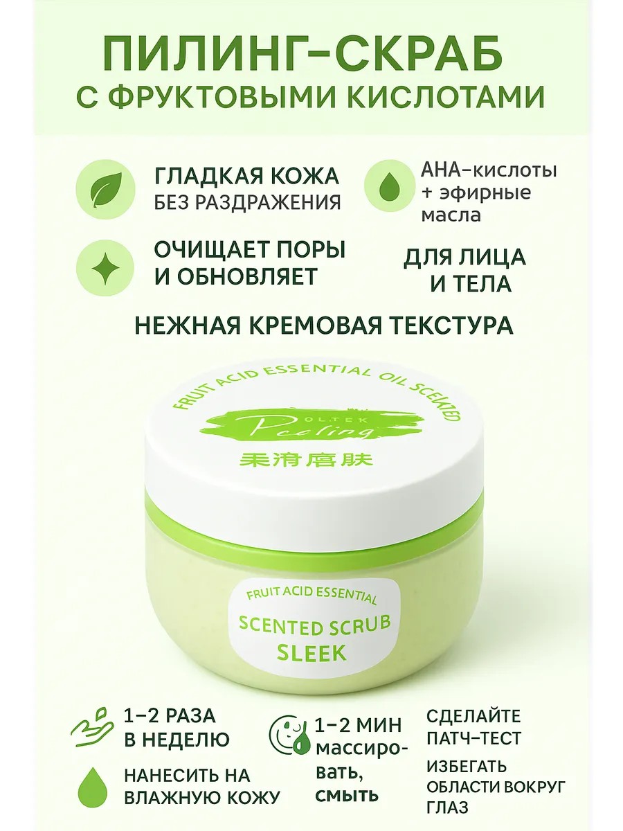 Sleek Peeling Fruit Acid Essential Oil Scented Scrub — нежный скраб-пилинг для лица и тела с фруктовыми кислотами (AHA) и эфирными маслами. Формула мягко растворяет ороговевшие клетки, а деликатные эксфолиирующие частицы аккуратно полируют поверхность кожи. Уже после первого применения кожа выглядит более гладкой и свежей, поры визуально чище, выравнивается тон и появляется естественное сияние. Идеально для регулярного ухода, когда нужен быстрый «домашний глянец» перед макияжем или важной встречей.