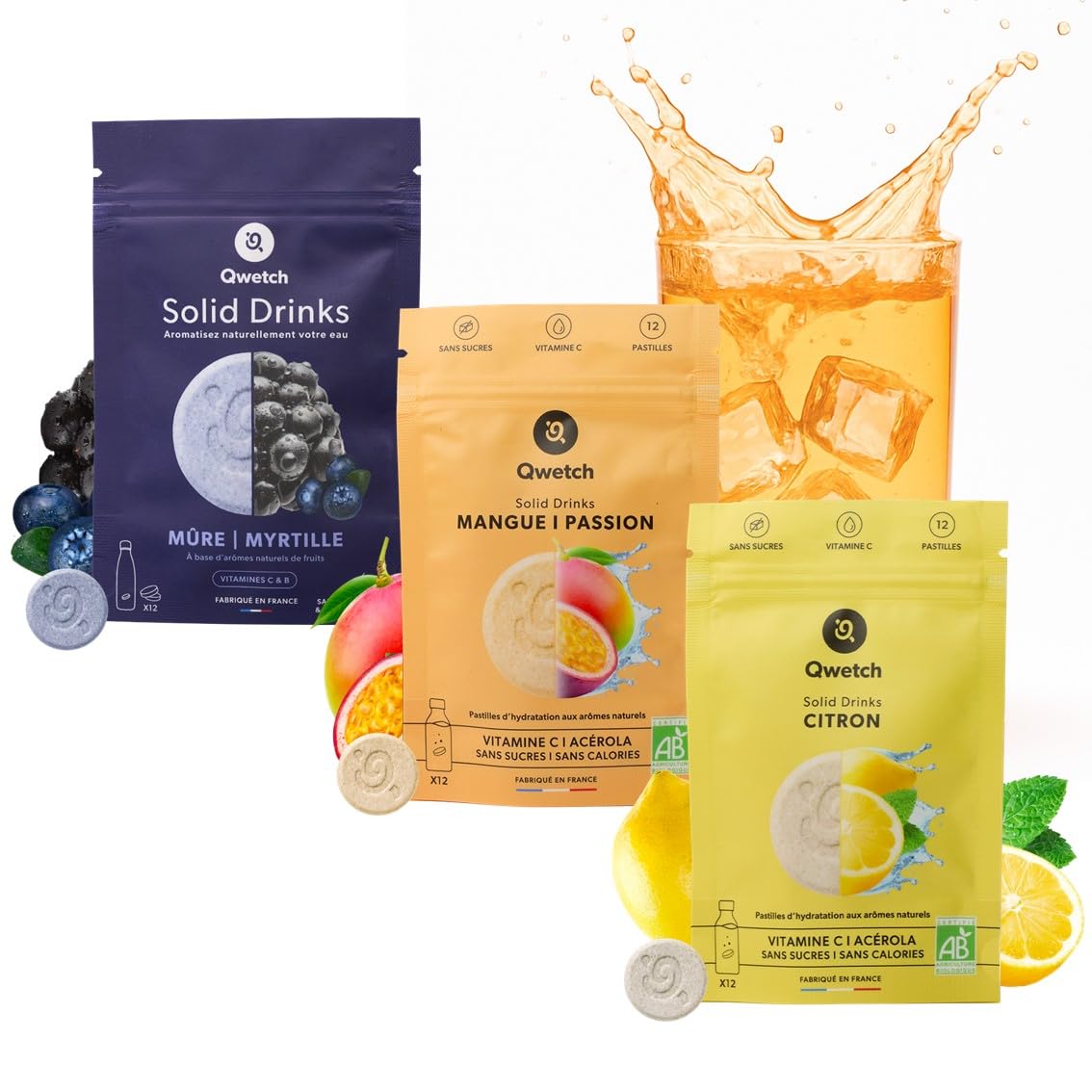 VEGAN, ZERO CALORIE, MADE IN FRANCE Gluten-free, with no artificial colors or flavors, and no harmful or unnecessary additives. A healthy and ethical choice for your wellness breaks. ORGANIC VITAMIN C VITAMIN C B FORMULAS This set combines 2 certified organic recipes – Lemon and Mango Passion Fruit – made with natural vitamin C from organic acerola, and 1 recipe – Blackberry Blueberry – a source of vitamins C B1, B3, B5, B6, to support energy, reduce fatigue, and promote concentration. A combination of well-being and performance for everyday life. ZESTY FRUITY FLAVORS This set brings together balanced and fruity flavors: Lemon (zesty and invigorating), Mango Passion Fruit (exotic and sweet), Blackberry Blueberry (round and fruity). A variety of flavors for easier drinking. SUGAR-FREE CALORIE-FREE HYDRATING DRINK Hydrate yourself differently: without sugars, sweeteners, or artificial colors. A healthy and thirst-quenching alternative to sodas and syrups, so you can enjoy drinking more water any time of day. HOW DOES IT WORK? It's simple: Add 1 SOLID DRINKS tablet to 400 to 600 ml of still or sparkling water, according to your preference. Let the tablet dissolve completely, then enjoy a refreshing and healthy drink, wherever you are. 36 Tablets 18 Liters of Drink.Qwetch SOLID DRINKS BIO – 36 Pastilles d'hydratation avec Vitamines C B – Boisson Sans Sucres, Sans Calories – Saveurs Citron, Mangue Passion, Mûre Myrtille – Vegan, Fabriqué en FranceVEGAN, ZÉRO CALORIE, FABRIQUÉ EN FRANCE Sans gluten, sans colorant ni arôme artificiel, et sans additifs nocifs et superflus. Un choix santé et éthique pour vos pauses bien-être. FORMULES BIO VITAMINE C COCKTAIL VITAMINÉ C B Ce coffret combine 2 recettes certifiées BIO – Citron et Mangue Passion – à base de vitamine C naturelle issue de l'acérola bio, et 1 recette– Mûre Myrtille – source de vitamines C B1, B3, B5, B6, pour soutenir l'énergie, réduire la fatigue et favoriser la concentration. Une alliance bien-être et performance au quotidien. SAVEURS PEP'S FRUITÉES Ce coffret réunit des saveurs équilibrées et fruitées : Citron (zesté et vivifiant), Mangue Passion (exotique et douce), Mûre Myrtille (ronde et fruitée). Une palette gustative variée pour boire plus facilement. BOISSON HYDRATANTE SANS SUCRE SANS CALORIE Hydratez-vous autrement : sans sucres, sans édulcorants ni colorants artificiels. Une alternative saine et désaltérante aux sodas et sirops, pour boire plus d'eau avec plaisir, à tout moment de la journée. COMMENT ÇA FONCTIONNE ? C'est simple : Ajoutez 1 pastille SOLID DRINKS dans 400 à 600 ml d'eau, plate ou gazeuse selon vos préférences. Laissez la pastille se dissoudre entièrement, puis dégustez une boisson rafraîchissante et saine, où que vous soyez. 36 Pastilles 18 Litres de Boisson.