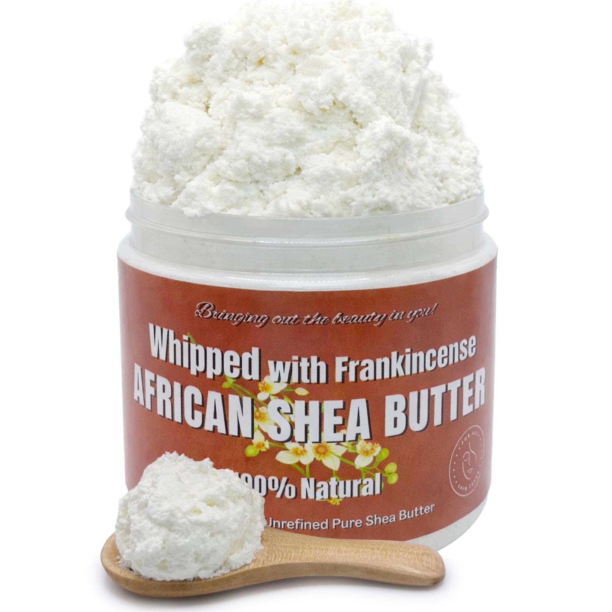 RA Cosmetics Whipped African Shea Butter with Frankincense is a luxurious, lightweight body butter designed to deeply moisturize, nourish, and protect skin and hair. Made from 100 unrefined African shea butter sourced from Ghana, this scented body butter for women features a silky texture that melts into the skin for lasting hydration. Infused with frankincense essential oil, it delivers an earthy, aromatic scent valued for its calming and skin-supportive benefits, making it a soothing addition to daily skincare routines. Rich in vitamins A, E, and F, natural fatty acids, and antioxidants, this African body butter helps improve elasticity, restore moisture balance, and support a youthful-looking complexion. Ideal for dry skin, dull patches, elbows, heels, hands, and cuticles, it helps reduce dryness and flakiness while promoting a radiant, healthy glow. With consistent use, it helps balance moisture in your skin and hair. This shea moisture body butter also serves as a conditioning treatment for hair and scalp. It tames frizz, enhances shine, conditions curls and coils, and supports healthy-looking growth. Use as a leave-in conditioner, twist-out styling cream, or scalp moisturizer for thick, textured, and 4C hair types. Gentle and natural, it is suitable for women, men, and children and performs well on sensitive or mature skin. Free from synthetic fillers, parabens, mineral oils, and harsh additives, RA Cosmetics all natural body butter with Frankincense is a clean beauty option for those seeking natural skincare and hair care solutions. Whether used as a daily moisturizer, conditioning balm, or nourishing body butter, it delivers head-to-toe hydration and velvety softness. Our scented body butter for men and women is perfect for those who love sweet, gourmand scents and crave deeply moisturized skin and hair. Treat yourself to the benefits of unrefined shea butter and enjoy sweetly scented results every day. Incorporate it into your morning or evening routine for beautifully moisturized results.WHO CAN BENEFIT: Gentle for daily use on women, men, and children with dry, sensitive, or mature skin. Ideal for those seeking natural body care, a clean beauty moisturizer, or Whipped shea butter for hair with aromatic benefits of frankincense. HOW TO USE: Warm a small amount of shea body butter between palms until melted, then massage into damp skin to seal in hydration. Use on elbows, knees, and heels for extra softness, or apply to hair and scalp as a conditioning treatment. Works well as a nightly moisturizer for deeper, restorative hydration. WHY IT WORKS: Rich in vitamins A, E, and F, fatty acids, and antioxidants, this whipped shea butter cream replenishes moisture, boosts elasticity, and promotes a youthful-looking complexion. Frankincense oil adds a soothing aroma valued for its revitalizing skin-supportive properties. DEEPLY MOISTURIZES SOFTENS: Ideal for dry skin, rough patches, and dull areas, this nutrient-rich whipped shea butter for skin delivers deep hydration and creates a natural barrier against environmental stressors. Softens elbows, knees, heels, cuticles, and hands while helping calm skin and reduce visible dryness and flakiness. PREMIUM WHIPPED BODY BUTTER FROM WEST AFRICA: Handcrafted in Ghana, this unrefined African shea butter is whipped into a soft, creamy body butter and infused with frankincense essential oil. This traditional skincare staple hydrates and nourishes from head to toe with a radiant finish.