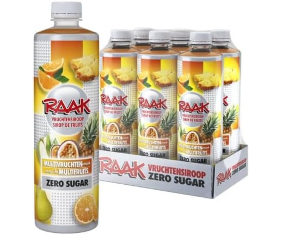 DUTCH QUALITY SINCE 1920 — A Dutch family brand. Perfect for still water, sparkling water, mocktails, and recipes. Fast delivery in secure packaging. READY IN 10 SECONDS — Mix 1 part syrup 7 parts still or sparkling water. One bottle 30 drinks. Compatible with sparkling water makers like SodaStream. 5 REAL FRUITS IN 1 — Apple (8 ), orange, passion fruit, pear, and pineapple. Fruit juice made from concentrate for an authentic, fruity taste. ZERO SUGAR, ZERO CALORIES — Only 1 kcal per drink. No added sugar, sweetened with Stevia. Gluten-free vegan. Ideal for diets, diabetes, and weight management. PACK OF 6 BOTTLES x 750ml — 4.5 liters of concentrated syrup 180 glasses of ready-to-drink beverage. Only €0.17 per glass. The most economical family pack compared to bottled multi-fruit drinks.QUALITÉ HOLLANDAISE DEPUIS 1920 — Marque familiale néerlandaise. Parfait pour eau plate, eau gazeuse, cocktails sans alcool et recettes. Livraison rapide en pack sécurisé. PRÊT EN 10 SECONDES — Mélangez 1 dose de sirop 7 doses d'eau plate ou gazeuse. Une bouteille 30 verres. Compatible avec les machines à eau gazeuse type SodaStream. 5 VRAIS FRUITS EN 1 — Pomme (8 ), orange, fruit de la passion, poire et ananas. Jus de fruits à base de concentré pour un goût authentique et fruité. ZÉRO SUCRE, ZÉRO CALORIE — Seulement 1 kcal par verre. Sans sucre ajouté, édulcoré avec Stevia. Glutenfree vegan. Idéal pour régimes, diabète et contrôle du poids. LOT DE 6 BOUTEILLES x 750ml — 4,5 litres de sirop concentré 180 verres de boisson prête. Seulement 0,17 € par verre. Le pack familial le plus économique vs boissons multifruits en bouteille.RAAK Sirop Multifruits ZERO SUCRE 6x750ml 180 Verres 5 Fruits en 1 Parfait Régimes Familles