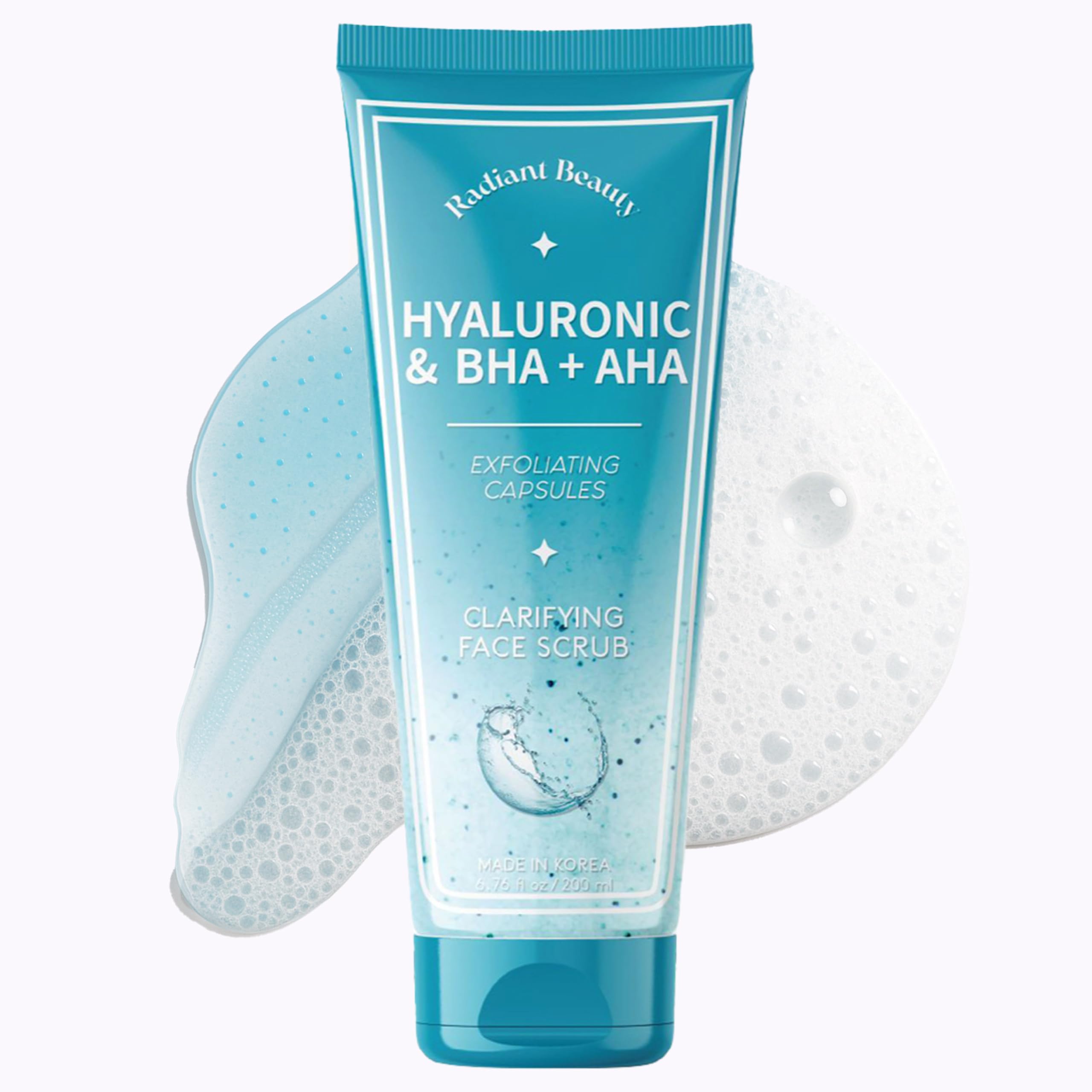 Discover the renewing power of Radiant Beauty's Hyaluronic Acid and AHA plus BHA Exfoliating Face Scrub, a Korean skin care essential crafted for individuals with congested, rough, or dull-looking skin who want a deeply cleansing yet gentle exfoliating experience. This exfoliating facial scrub is designed to polish away surface impurities while supporting a smoother and more refined appearance. AHA and BHA work together to exfoliate the surface and loosen buildup, helping reveal a softer and more refreshed look without aggressive scrubbing. Hyaluronic acid, vegan glycerin, and vitamin E provide comforting moisture to help maintain balance, supporting a smooth and hydrated feel during exfoliation. Ideal for those experiencing rough texture, visible buildup, or skin that feels less fresh, this Korean exfoliant helps promote a polished and renewed appearance with each use. The lightweight, fast absorbing formula makes this exfoliating facial scrub easy to incorporate into a weekly routine, offering a spa inspired Korean skincare moment at home. Crafted according to strict clean beauty standards, this face scrub is dermatologist tested, vegan, cruelty free, paraben free, sulfate free, non GMO, and phthalate free, made with 95 percent natural ingredients for a gentle yet effective experience suitable for many skin types. To use, massage onto damp skin, allow the gentle acids and exfoliating particles to glide across areas of buildup, then rinse well to reveal a smoother feeling surface. Whether you are seeking a Korean face scrub, exfoliante facial, gentle face exfoliator, or an AHA BHA exfoliant to support smoother texture and a refreshed look, Radiant Beauty delivers a refined formula inspired by Korean beauty traditions to help enhance smoothness, freshness, and a renewed appearance.SATISFACTION GUARANTEED – We stand behind our K-beauty face scrub formula. If you're not completely satisfied or have any issues with our product or results, contact our skin care experts and we'll give you a refund, no questions asked. EASY TO USE FOR INSTANT REFRESHMENT – Apply this fast absorbing exfoliating face scrub to damp skin, massage in circular motions to polish away impurities, and rinse thoroughly for a soft, refreshed feel that fits seamlessly into any skincare routine. CLEAN BEAUTY YOU CAN TRUST – Dermatologist tested and crafted with 95 percent natural ingredients. This Korean exfoliating face scrub is vegan, cruelty free, non GMO, paraben free, sulfate free, and phthalate free for safe, gentle exfoliation. POWERFUL AHA BHA HYALURONIC ACID COMPLEX – AHA and BHA exfoliate to lift away buildup while hyaluronic acid and vitamin E hydrate and cushion the skin. This balanced blend works together to refine texture and support a smoother, clearer complexion. REVEAL SMOOTHER SKIN WITH GENTLE RENEWAL – Experience a lightweight, refreshing face scrub that helps congested, rough, or dull skin feel polished, renewed, and deeply cleansed. Ideal for anyone seeking Korean skin care results with a soft, radiant looking finish.