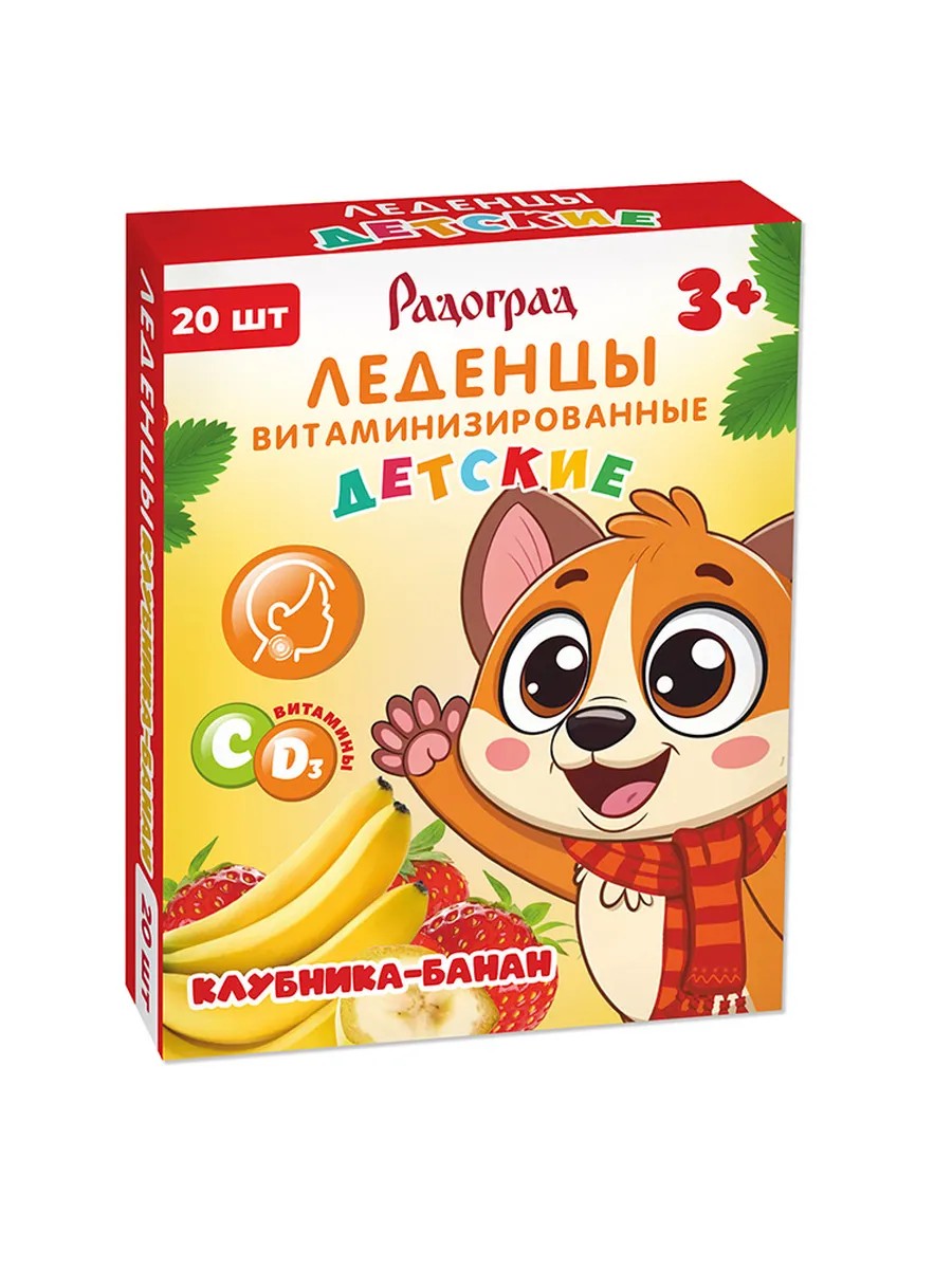 Full name of the productRadograd fortified children's lollipops with strawberry-banana flavor, 20 pcs. lollipops weighing 3.2 g