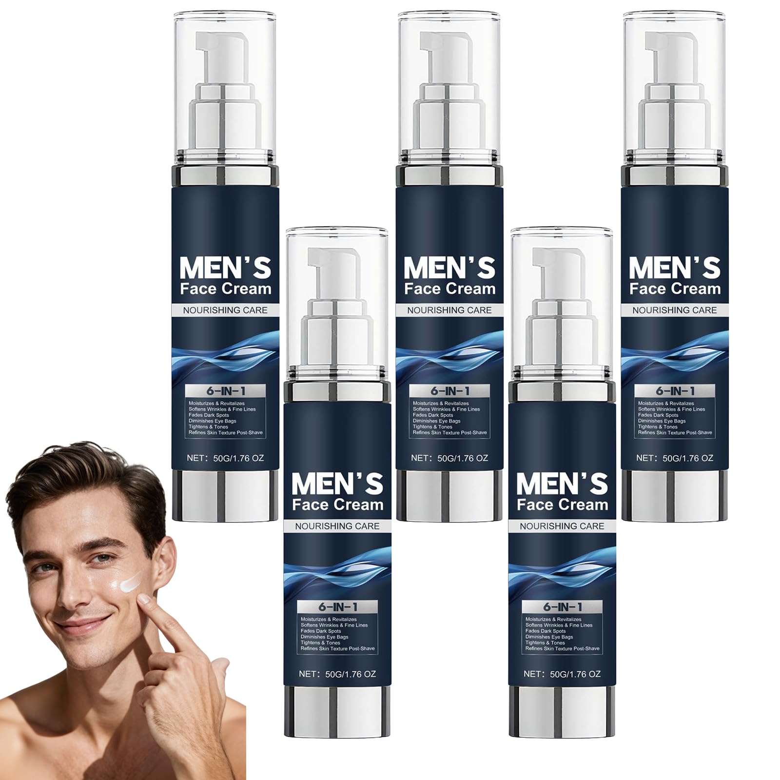 Discover our advanced men's face moisturizer, designed as a 6-in-1 solution for daily skincare. This anti-wrinkle cream firms the skin, reduces signs of fatigue, and provides all-day protection. Acting as a dark spot corrector and moisturizer, it evens skin tone and soothes irritation after shaving. The perfect lightweight men's face care product for work, sports, or travel, keeping skin feeling fresh, hydrated, and confident. Directions: 1. Cleanse and dry your face. 2. Apply an appropriate amount and spread evenly over the face. 3. Gently massage until absorbed. Specifications: Product Name: Men's Face Cream Net Contents: 50g Shelf Life: 3 years Target Audience: Adult Men All skin types Package contents: 1 2 3 4 5 6 men's face creams NOTE: 1. Please allow 1-2 cm difference due to manual measurement. 2. Due to differences in display and lighting, the actual color of the item may be slightly different from the picture. Thank you for your understanding. After-sales service: If you have any problems while purchg or using our products, please contact us promptly we will reply within 24 hours. SAFETY WARNING Store in a cool, dry place away from light. Keep out of reach of children.Men's Gentle Daily Care Formulated with vitamin E and safe ingredients, this men's cream absorbs quickly without leaving a greasy residue. Suitable for all skin types, keeping skin nourished, radiant, and strong. Soothing Aftershave Lotion Works as an aftershave, calming irritation and leaving skin soft, smooth, and protected all day long. Ideal for a daily men's grooming routine. Dark Circles Spots Treatment This multi-action men's face cream reduces dark circles, puffiness, and dark spots, improving skin tone and giving a fresh, revitalized, and luminous appearance. Men's Moisturizing Cream With hyaluronic acid and shea butter, this men's moisturizing cream intensely nourishes, retains moisture, and restores balance to dry, oily, or sensitive skin. Men's Firming Face Cream Targets wrinkles and sagging skin, supports elasticity and firmness, providing smoother, more youthful-looking skin. Ideal as a daily anti-wrinkle face cream for men.Crème Visage 6-en-1 Homme, Soin Hydratant Anti-Âge Réduit Rides, Cernes Taches Brunes, Crème Hydratante Visage Homme pour Peau Sèche, Grasse Sensible, Lotion Après-Rasage Multi-Action (5pcs)DESCRIPTION DU PRODUIT DESCRIPTION DU PRODUIT Découvrez notre crème hydratante visage homme avancée, conçue comme une solution 6-en-1 pour le soin quotidien. Cette crème anti-rides homme raffermit la peau, réduit les signes de fatigue et protège toute la journée. Agissant comme un soin anti-taches brunes et une lotion hydratante, elle améliore le teint et apaise les irritations après le rasage. Parfait soin visage homme léger pour le travail, le sport ou les voyages, gardant la peau fraîche, hydratée et confiante. Mode d'emploi : 1. Nettoyez et séchez votre visage. 2. Appliquez une quantité appropriée et répartissez uniformément sur le visage. 3. Massez doucement jusqu'à absorption. Spécifications : Nom du produit : MEN'S Face Cream Contenu net : 50 g Durée de conservation : 3 ans Public cible : Hommes adultes Tous types de peau Contenu de l'emballage : 1 2 3 4 5 6 crèmes visage pour hommes REMARQUE : 1. Veuillez prévoir une différence de 1 à 2 cm en raison de la mesure manuelle. 2. En raison des différences d'affichage et de luminosité, la couleur réelle de l'article peut être légèrement différente de celle de la photo. Merci de votre compréhension. Service après-vente : En cas de problème lors de l'achat ou de l'utilisation de nos produits, veuillez nous contacter à temps nous vous répondrons dans les 24 heures. AVERTISSEMENT DE SÉCURITÉ À conserver dans un endroit frais et sec, à l'abri de la lumière. Tenir hors de portée des enfants.Soin Quotidien Doux Homme Formulée avec vitamine E et ingrédients sûrs, cette crème homme pénètre rapidement sans effet gras. Convient à tous types de peaux, gardant la peau nourrie, éclatante et forte. Lotion Après-Rasage Apaisante Fonctionne comme soin après-rasage, calme les irritations et laisse la peau douce, lisse et protégée toute la journée. Idéal pour une routine soin homme quotidienne. Soin Cernes Taches Crème visage multi-action homme réduit cernes, poches et taches brunes, améliorant le teint et donnant un aspect frais, revitalisé et lumineux. Crème Hydratante Homme Avec acide hyaluronique et beurre de karité, cette crème hydratante homme nourrit intensément, retient l'hydratation et restaure l'équilibre des peaux sèches, grasses ou sensibles. Crème Visage Raffermissante Homme Cible rides et relâchement cutané, soutient l'élasticité et la fermeté, offrant une peau plus lisse et rajeunie. Idéal comme crème anti-rides visage homme au quotidien.
