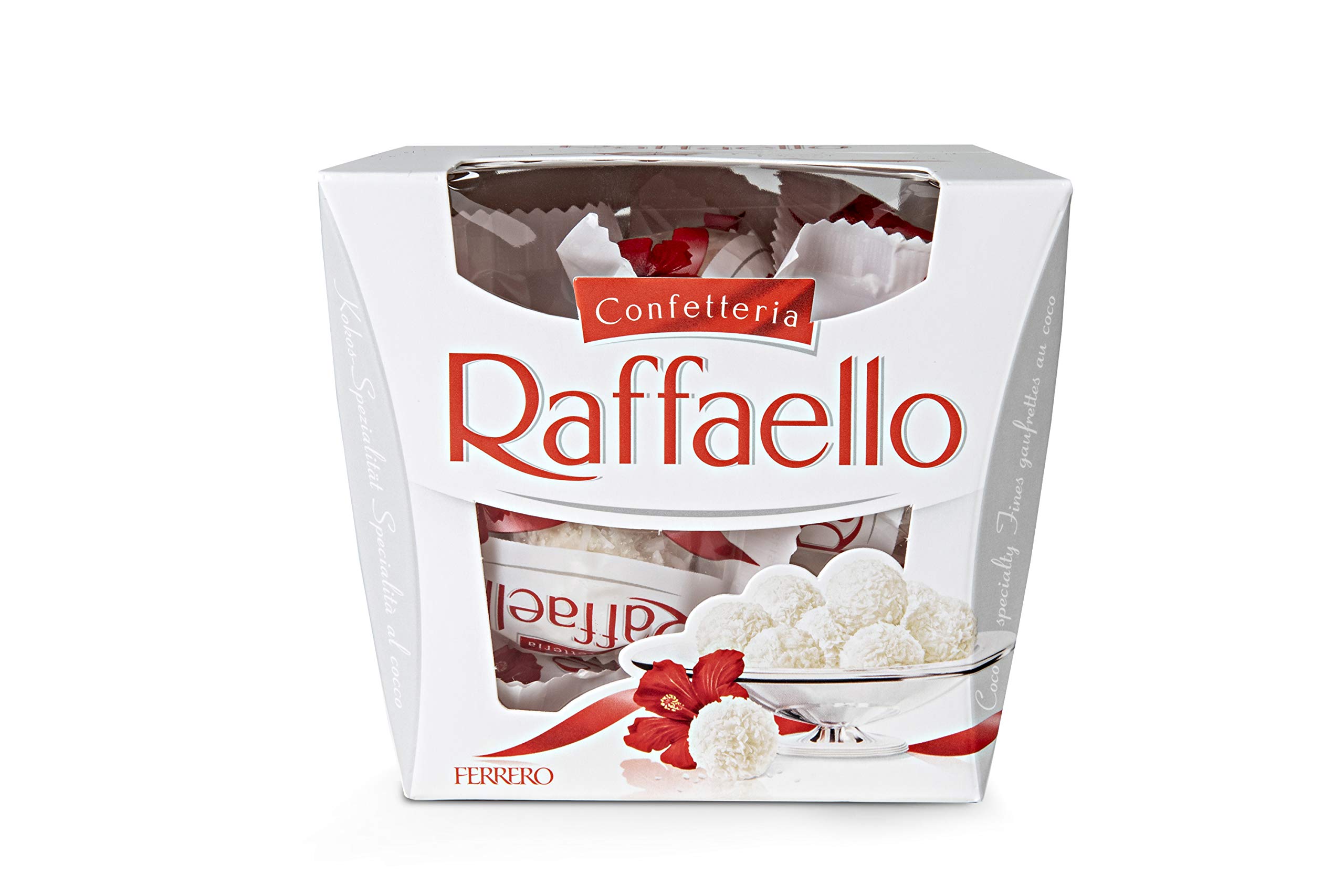 Crunchy coconut-almond specialties. RAFFAELLO: Thin wafers coated in coconut filled with coconut and whole almonds. For your health, avoid eating too much fat, too much sugar, too much salt. FERRERO France CS90058 76136 MONT-SAINT-AIGNAN INGREDIENTS Grated coconut 25.5 , vegetable fats (palm, shea), sugar, ALMOND 8 , skimmed MILK powder, WHEY powder, WHEAT flour, starch, flavorings, emulsifiers (SOY lecithins), raising agents (sodium hydrogen carbonate), salt. Allergens: ALMONDS, MILK, WHEAT, SOY DIRECTIONS FOR USE Store in a dry place away from heat. DISCLAIMER: Photography not contractual. The above information is provided for informational purposes only. It is not necessarily exhaustive and cannot replace the information on the product packaging, which alone is authoritative and to which you are invited to refer, particularly in the event of food intolerance. Box of 18, 180g. Spécialités croquantes au coco-amande. RAFFAELLO : Fines gaufrettes enrobées de noix de coco fourrées noix de coco avec amande entiÈre Pour votre santé, évitez de manger trop gras, trop sucré, trop salé. FERRERO France CS90058 76136 MONT-SAINT-AIGNAN INGRÉDIENTS Noix de coco râpée 25,5 , graisses végétales (palme, karité), sucre, AMANDE 8 , LAIT écrémé en poudre, LACTOSERUM en poudre, farine de FROMENT, amidon, arômes, émulsifiants (lécithines ÝSOJA ), poudres à lever (carbonate acide de sodium), sel. Allergènes : AMANDES, LAIT, FROMENT, SOJA MODE D'EMPLOI A conserver au sec et à l'abri de la chaleur CLAUSE DE NON-GARANTIE Photographie non contractuelle. Les indications ci-dessus sont données à titre d'information. Elles ne sont pas forcément exhaustives et ne sauraient se substituer aux informations figurant sur l'emballage du produit qui font seules foi, et auxquelles vous êtes invités à vous reporter, notamment en cas d'intolérance alimentaire. La boîte de 18, 180g.