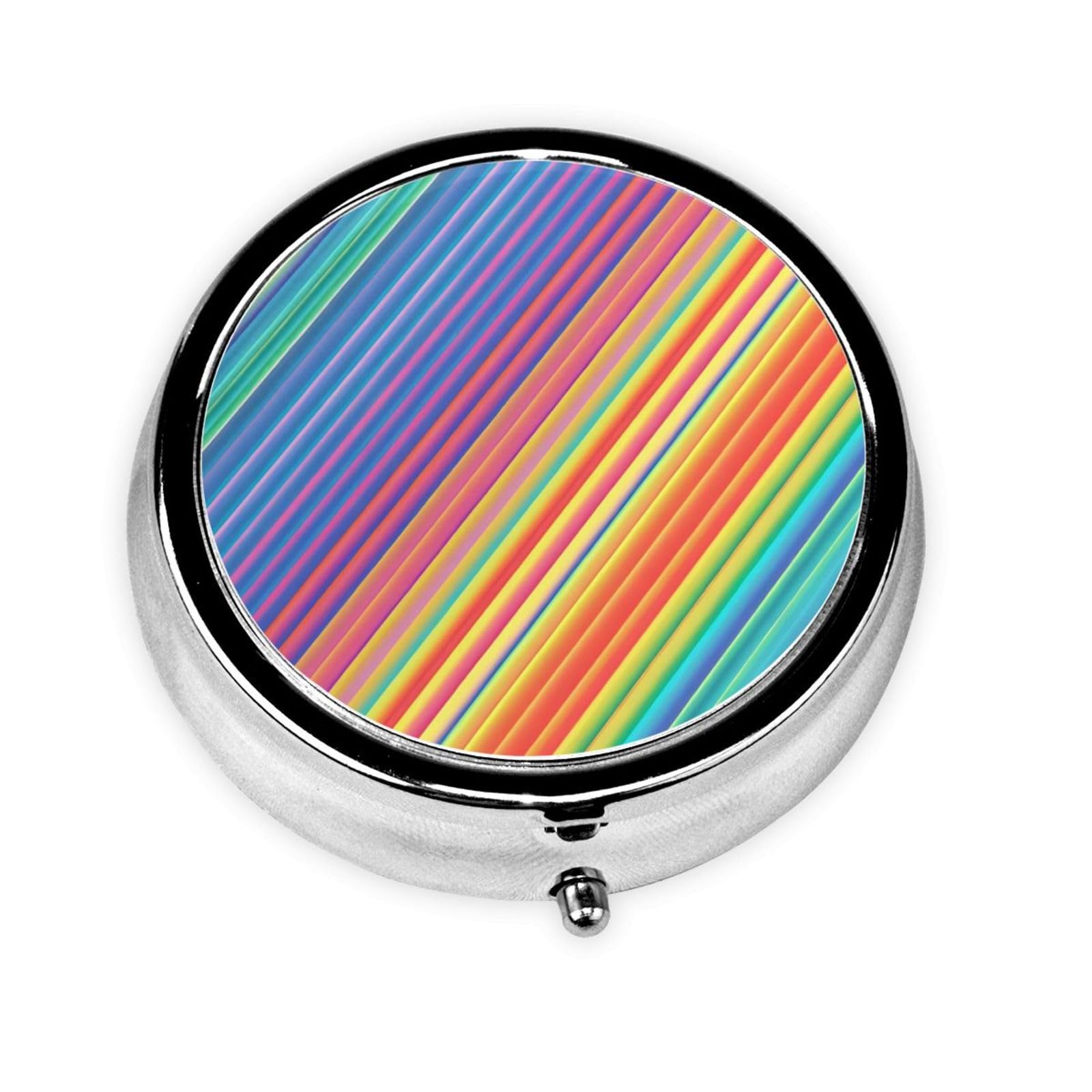 Rainbow colored lines round mini pill box is made of metal iron plating material, environmentally friendly metal, mini and portable, perfect for carrying in your pocket or purse, ideal for your travels. The button design is easy to open and comes with a 3-compartment plastic insert to fit small pills. The size is 2.0x2.0x0.7 inches, lightweight and portable, a good helper for travel!
