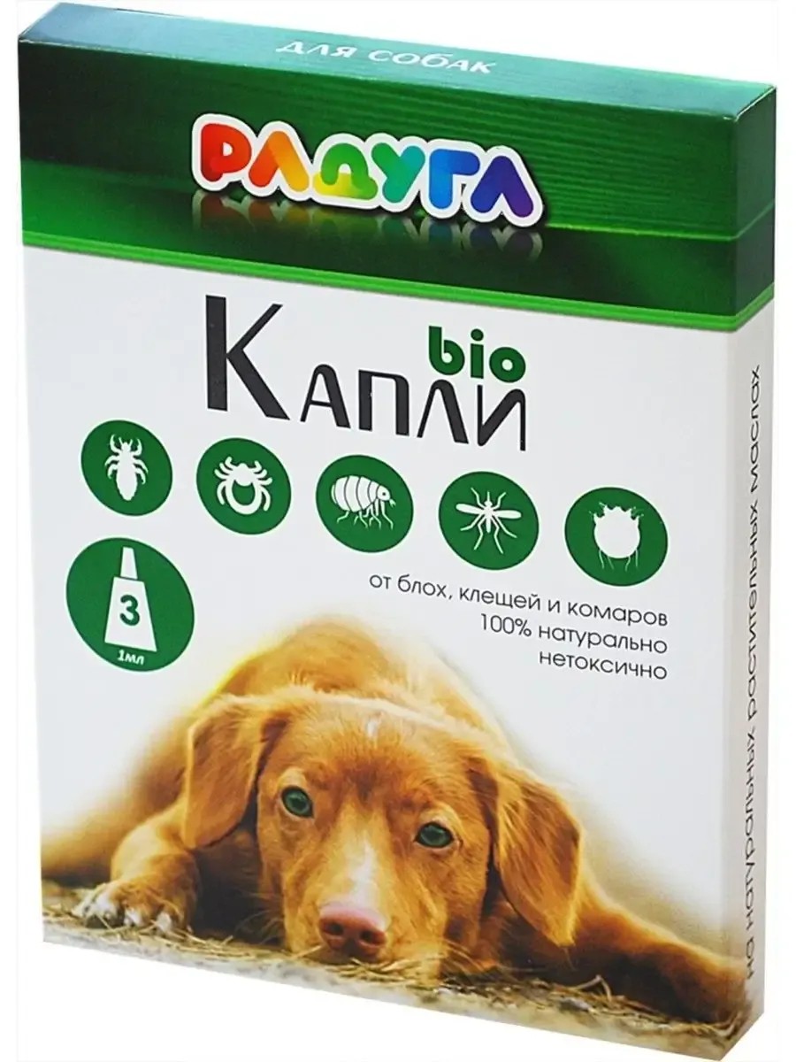 БИО капли «Радуга» для собак, репеллентное средство, безопасное и эффективное, на основе натуральных компонентов, для отпугивания эктопаразитов - блох, клещей, власоедов, вшей, комаров, мух. Новая активная биоформулаБио капли безопасны для человека и животных, не имеют ограничений по возрасту.Состав: натуральные эфирные масла цитронеллы, ним, пихты, наполнитель, стабилизатор.Упаковка – в пипетках, 3шт по 1 мл в картонной коробочке.Способ применения – отрезать кончик пипетки и выдавить препарат на кожу в области шеи (холки) животного. Доза для собак до 10 кг - 1 мл, от 10 до 20 кг – 2 мл, от 30 кг – 3 мл, повторять обработку один раз в две недели.Рекомендовано применять совместно с БИО ошейником «Радуга».