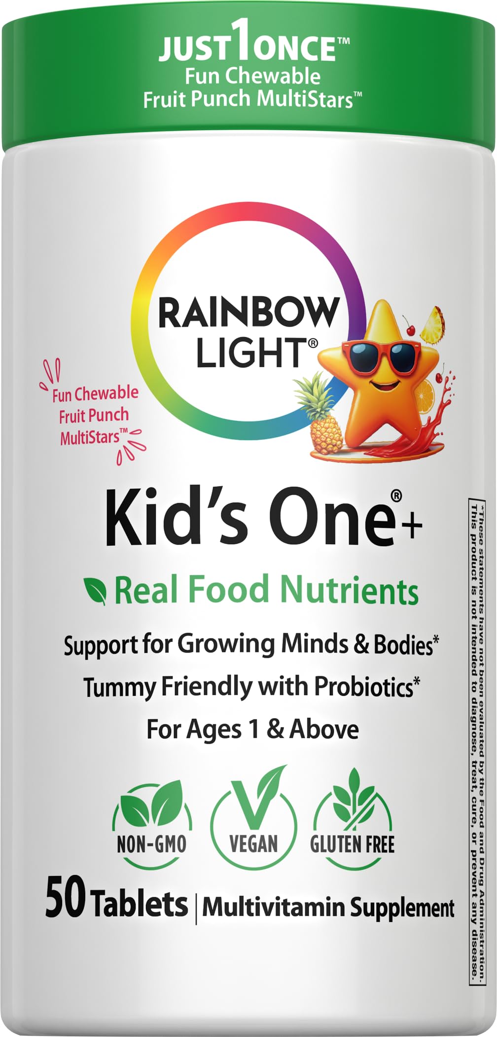 Rainbow Light Kids One + Multivitamin | 50 Chewable Tablets | with Iron & Tummy Friendly Probiotics | Fruit Punch Flavor | Real Food Nutrients
