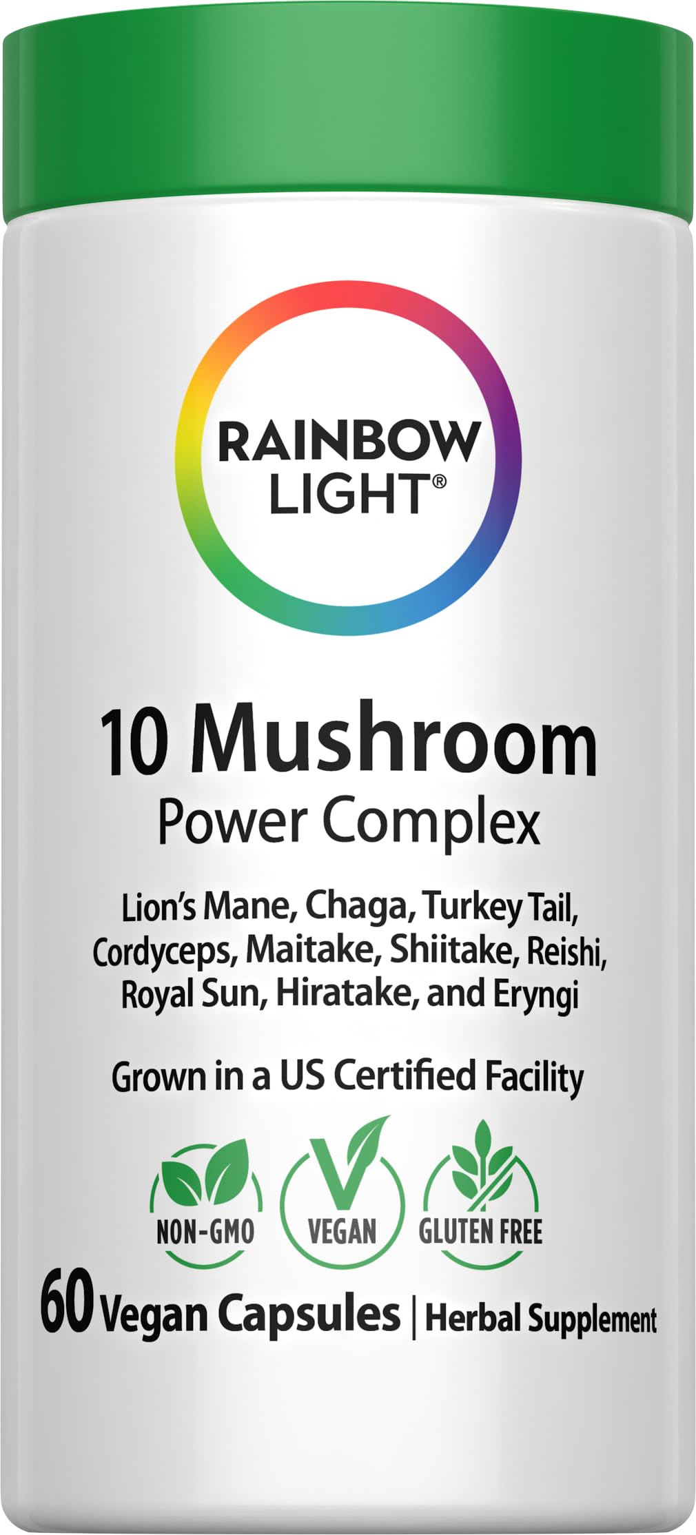 What does full lifecycle mushrooms mean? When we say that our formula includes full lifecycle mushrooms, it means that the supplement contains all the major growth stages of the mushroom – as opposed to isolated parts like just the fruiting body. In our formula, each mushroom includes four key components: Primordia (the earliest stage of development), Mycelia (the root-like structure that absorbs nutrients), Fruiting Bodies (the visible part of the mushroom, often used in cooking), and Extracellular Compounds (substances released during growth). Our blend delivers more encompassing support by incorporating each growth phase of the mushroom. What is a superfood? Are mushrooms considered to be superfoods? Superfoods are foods that are rich in vitamins, minerals, nutrients, antioxidants, and other beneficial compounds that work to support your overall wellness. Mushrooms are considered a superfood as they naturally contain beneficial compounds. How is this mushroom supplement different from other ones? Rainbow Light 10 Mushroom Power Complex stands apart from other mushroom supplements for many reasons, the greatest being that it contains 10 different types of organic mushrooms in the ease of one formula. Additionally, this blend of 10 has been grown in a certified United States facility, using full lifecycle mushrooms for full-spectrum benefits. These statements have not been evaluated by the Food and Drug Administration. This product is not intended to diagnose, treat, cure, or prevent any disease.Simple Ingredients – Vegan and gluten free capsules made without wheat, milk, tree nuts, peanuts, soy, eggs, fish, shellfish, artificial flavors or artificial sweeteners. Convenient Vegan Capsules – Each serving provides a potent source of nutrient-dense superfoods in vegan capsules. Certified US Facility – Grown in a certified US facility using non-GMO practices to help ensure high-quality, beneficial active compounds. Full Lifecycle Mushrooms – Made from primordia, extracellular compounds, fruit bodies, and mycelia for broad-spectrum benefits. 10 Mushroom Power Complex – Features Lion's Mane, Chaga, Turkey Tail, Cordyceps, Maitake, Shiitake, Reishi, Royal Sun, Hiratake, and Eryngi.
