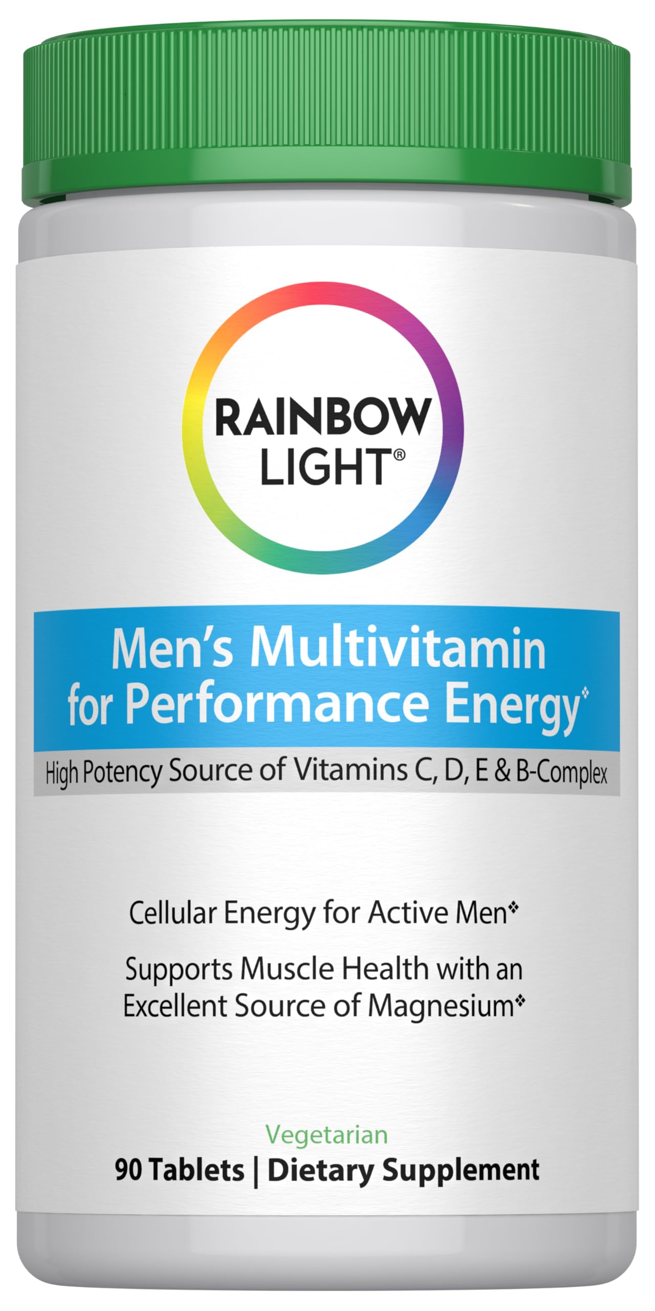 Rainbow Light Men's Multivitamin for Performance Energy fortifies men's bodies with the nutrients they need for cellular energy, muscle health support and overall wellness every day (1). Made especially for active men, this innovative dietary supplement provides an excellent source of magnesium to promote muscle health and key nutrients to support overall well-being (1). This high-potency multivitamin also contains a Performance Energy Blend for Men, vitamin B complex to support brain health, and antioxidants vitamin E, vitamin C and beta-carotene (1). A probiotic and enzyme blend in these multivitamins for men helps support digestive health (1). Each vegetarian tablet contains no milk, tree nuts, peanuts, eggs, fish or shellfish. Founded in 1981 in Santa Cruz, California, Rainbow Light has been passionate about holistic wellness and creating nutritional multivitamin supplements for men that prioritize potency and results for over 40 years. Rainbow Lights goal is to give you one less thing to worry aboutan easy way to give yourself and your family a solid foundation to thrive every day. (1) These statements have not been evaluated by the Food and Drug Administration. This product is not intended to diagnose, treat, cure or prevent any disease.DISCLAIMER: (1) These statements have not been evaluated by the Food and Drug Administration this product is not intended to diagnose, treat, cure or prevent any disease. WHO WE ARE: Founded 1981 in Santa Cruz, California, Rainbow Light is passionate about your holistic wellness and creates nutritional supplements that prioritize potency and results for over 40 years. VEGETARIAN TABLETS: Made with a Performance Energy Blend for Men and a probiotic and enzyme blend, this mens multivitamin is vegetarian and contains no milk, tree nuts, peanuts, eggs or fish. INSTRUCTIONS: Experience the difference this vitamin supplement can make by taking four vegetarian tablets daily with or between meals. GUT HEALTH: Vitamin supplement with a blend of beneficial probiotics and enzymes that help your body break down food, support good digestion and provide good bacteria for gut health (1). INGREDIENT BENEFITS: Rainbow Light vitamins support muscle health with magnesium, promote cellular energy for active men, offer free radical support, and promote immune, brain and digestive health (1). HIGH-POTENCY MULTIVITAMIN: Men's multivitamin that's an excellent source of magnesium and a high-potency source of zinc, selenium, copper, iodine and vitamin D, C, E and B-complex. HELPS MAINTAIN GOOD HEALTH FOR MEN: Made especially for active men, this multivitamin supplement promotes muscle health and supports overall well-being (1). MULTIVITAMIN SUPPLEMENTS FOR MEN: Includes one 90-count bottle of Rainbow Light Men's Multivitamin for Performance Energy, a vitamin that promotes cellular energy, muscle health and wellness (1).