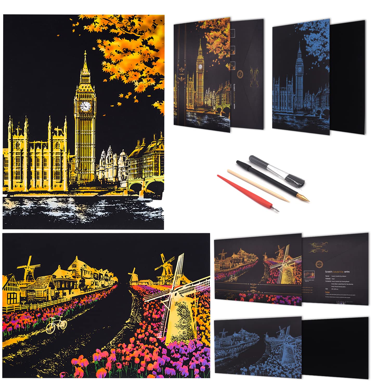 1.Each Scratch Night View has a layer of hand-drawn sketches that, according to the gray lines, can be scraped off to show the new colors below. 2.The product is equipped with a black paper of the same size, releg your imagination and creating your own luminous urban landscape. The original paintings will make you have different memories and feelings. 3.Great present for birthday,children's day,mother and father's day,valentine's day,wedding anniversary,anniversary celebration,etc.It seems no limite,suitable for any type of festival. 4.It's a funny and innovation toy for kids,also a very good way to train kids hands-in skills,intelligence development. Contents: 2*Scratch Drawing Board (Dutch Windmill, Big Ben),2*Black Diy Board 4*tools(included1xStick+1xRed small Scraper+1xScratch Pen+1xBlack Brush) Others: Weight:150g Size:40.5cmx28.5cm/11''x16'' Packing:Envelope Precautions: 1.This is a very clean entertainment project,No watercolor paint,You don't have to worry about watercolor paints stain your homelike before.It's a good news for parents. 2.Looking forward to seeing your wonderful DIY works in the comments. 3.Due to the difference between different monitors,the picture may not reflect the actual color of the item. 4.Our designs are constantly updated and we are eager to get your continued attention.✓ ?5. 100% Service Guarantee?-We will release new patterns from time to time. If you find any problems during the purchase process, please contact us in time and we will solve them as soon as possible. ✓ ?4. Scratch Art Set Include?-Including:2xScratch Drawing Board/2xBlank Board for Diy Drawing,1xWood Stylus Stick/1xRed small Scraper/1xScratch Pen/1xBlack Brush. ✓ ?3. Scratch Art for Kids and Adults to Kill Time?-If you want to kill time quietly, this size and weight are very convenient to carry, you can create at any time. This is a very clean entertainment project, don't worry about it staining your space. ✓?2. City Night Scratch Painting Paper VS Traditional Black Scratch Paper Art Set?-The real and beautiful city night view is hidden under the matte gray coating. It is an excellent DIY gift set for children aged 4 and up or adults. It can be used for various holiday gifts or party favors and birthday gifts. After completion, it will be a beautiful decoration. It is more collectible than traditional black scratch painting art paper. ✓?1. Scratchboard Art Material?-Our Scratch Art Rainbow painting paper is made of coated paper, odorless and non-toxic powder, and has passed CE-ROHS certification. And it is designed according to the real city night scene pictures, with a high degree of restoration.Size: Dutch windmill, London Big Ben. Educational Objective: play, Game. Color: Dutch Windmill,big Ben. Material: Paper. Brand: BOTEEN. Manufacturer: BOTEEN. Customer Reviews: 4.6 out of 5 stars 752 ratings 4.6 out of 5 stars. Best Sellers Rank: #56,802 in Arts, Crafts & Sewing. Manufacturer recommended age: 3 years and up. : B07Q5MKCC8. Item Weight: 11.2 ounces. Package Dimensions: 17 x 13.5 x 0.6 inches.