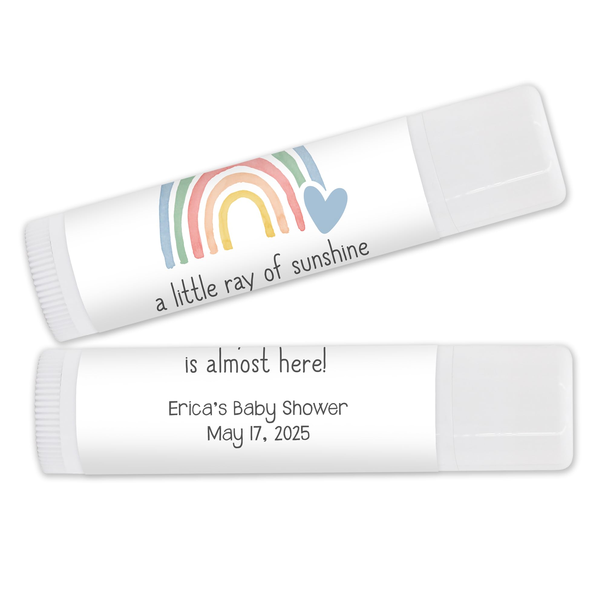Rainbow themed baby showers are so cute. We have the perfect rainbows for any baby shower. Just choose between the different color rainbows and the coordinating heart color. Our lip balm is personalized and can be used to celebrate your guests at the baby shower to to hand out as a birth announcement.