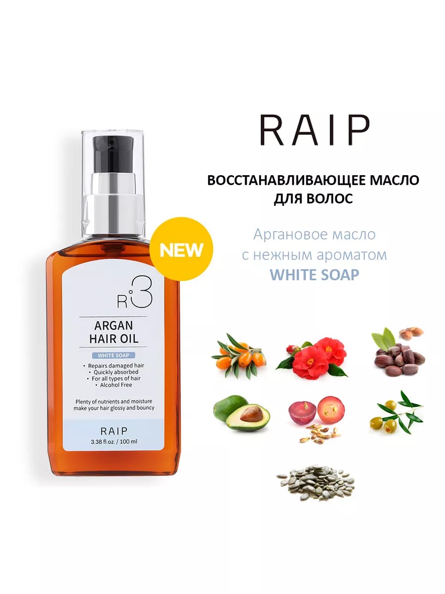 RAIP R3 ARGAN HAIR OIL White Soap R3 - hair oil is instantly absorbed, adds shine and softness, giving hair elasticity. The oil helps maintain hair hydrated, protects and supports it from various chemical procedures and external factors. White soap aroma has a pleasant, bright aroma that envelops hair in freshness. Contains notes of bergamot, ylang-ylang, orange blossom. How to use: Wash your hair as usual, blot it with a towel, evenly apply a small amount of oil to your palms, and then distribute it through damp hair, dry as usual. You can also apply to the ends of dry hair. Keep out of the reach of children. 100 ml / 3.38 fl.oz. RAIP Professional. HAIR CLINIC SYSTEM. MADE IN KOREA