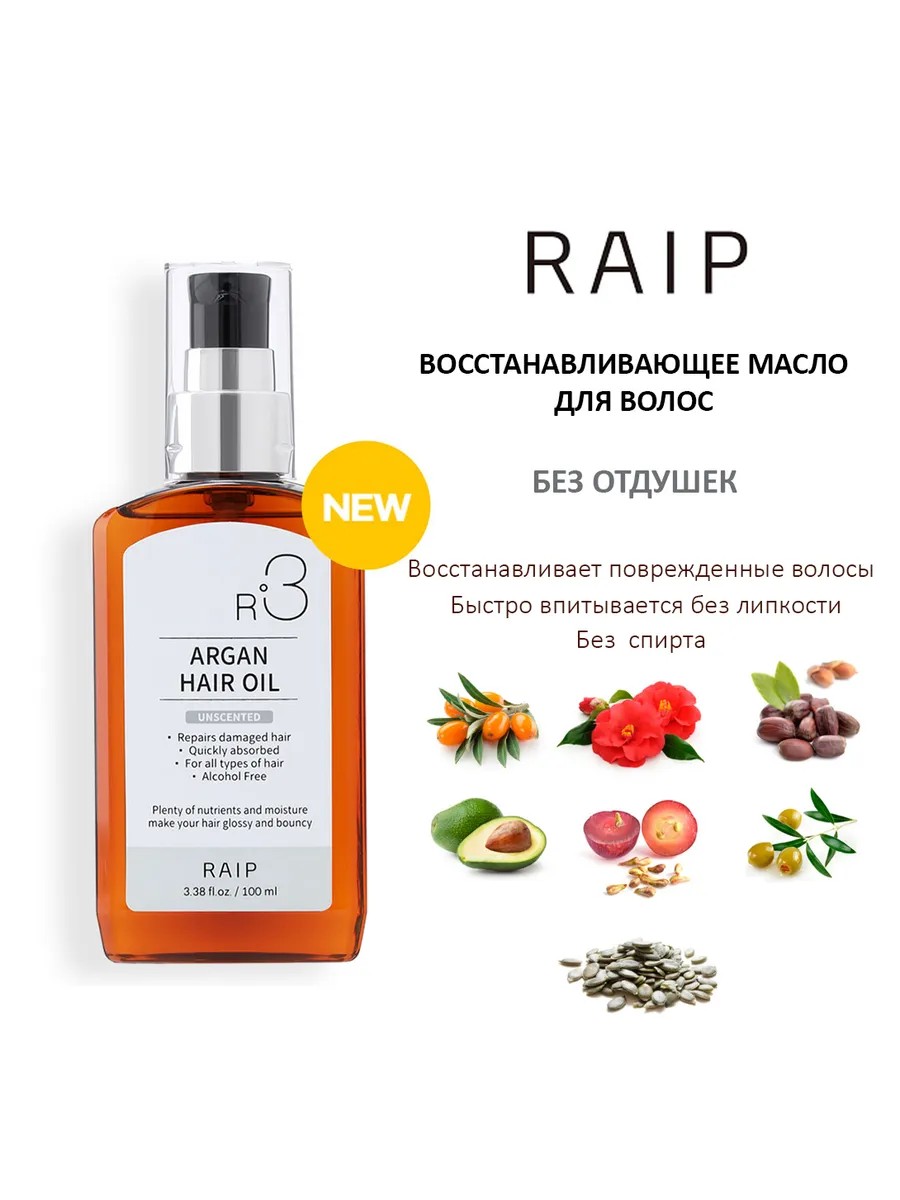 RAIP R3 ARGAN HAIR OIL Unscented R3 - hair oil is instantly absorbed, adds shine and softness, giving hair elasticity. The oil helps maintain hair moisture, protects and supports it from various chemical treatments and external factors. The oil does not contain aromatic components, without fragrances. How to use: Wash your hair as usual, blot it with a towel, evenly apply a small amount of oil to your palms, and then distribute it through damp hair, dry as usual. You can also apply to the ends of dry hair. Keep out of the reach of children. 100 ml / 3.38 fl.oz. RAIP Professional. HAIR CLINIC SYSTEM. MADE IN KOREA