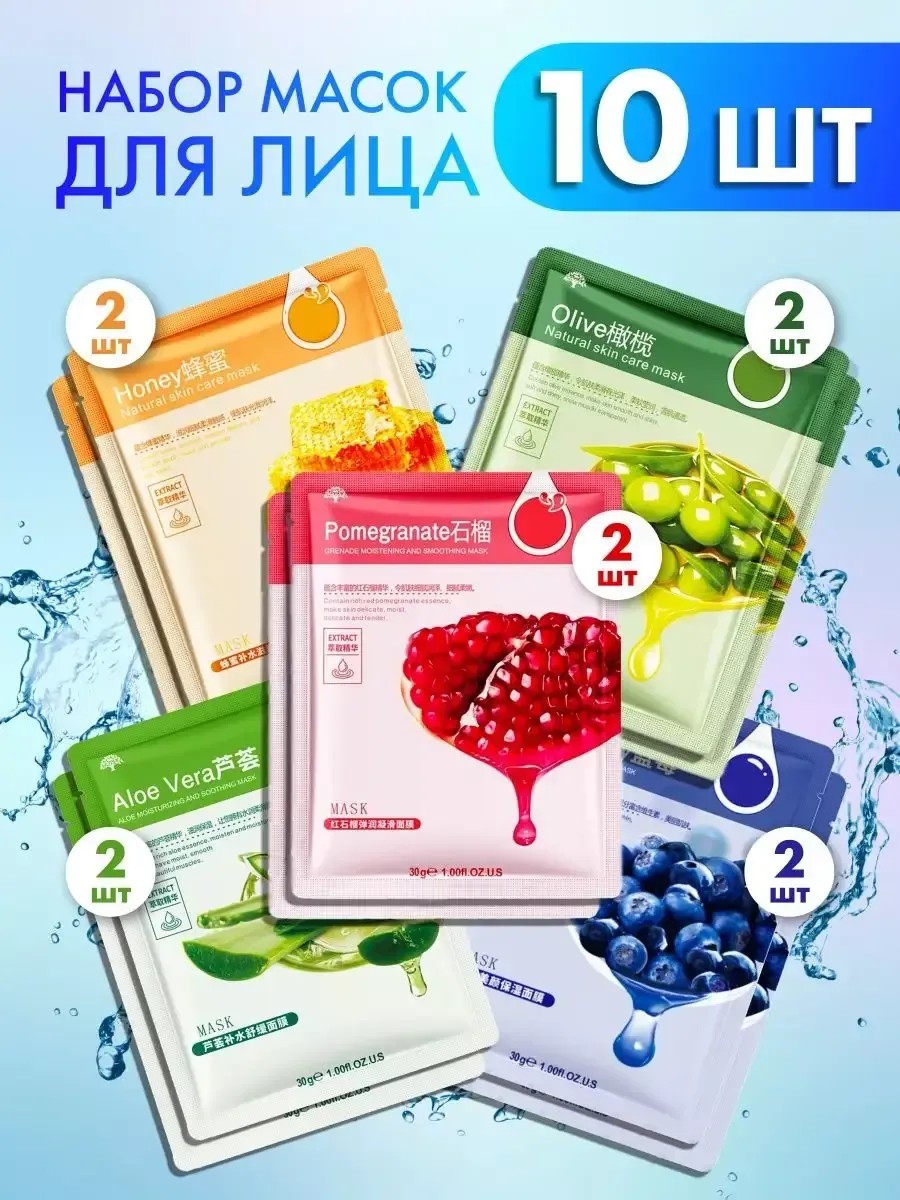 | Комплектация | Тканевые маски для лица набор; Маска в пакетике тканевая экстракт гранаты; Тканевая маска экстракт огурца; Экстракт оливы тканевая маска; Экстракт алоэ маска тканевая для кожи лица; Тканевая маска экстракт меда и лимона; Питательная маска для лица; Маска от шелушение кожи лица; Маска для упругости и сияние кожи тканевая; 10 шт - маска тканевая для кожи лица |
